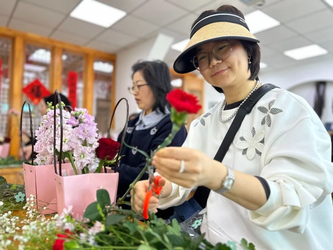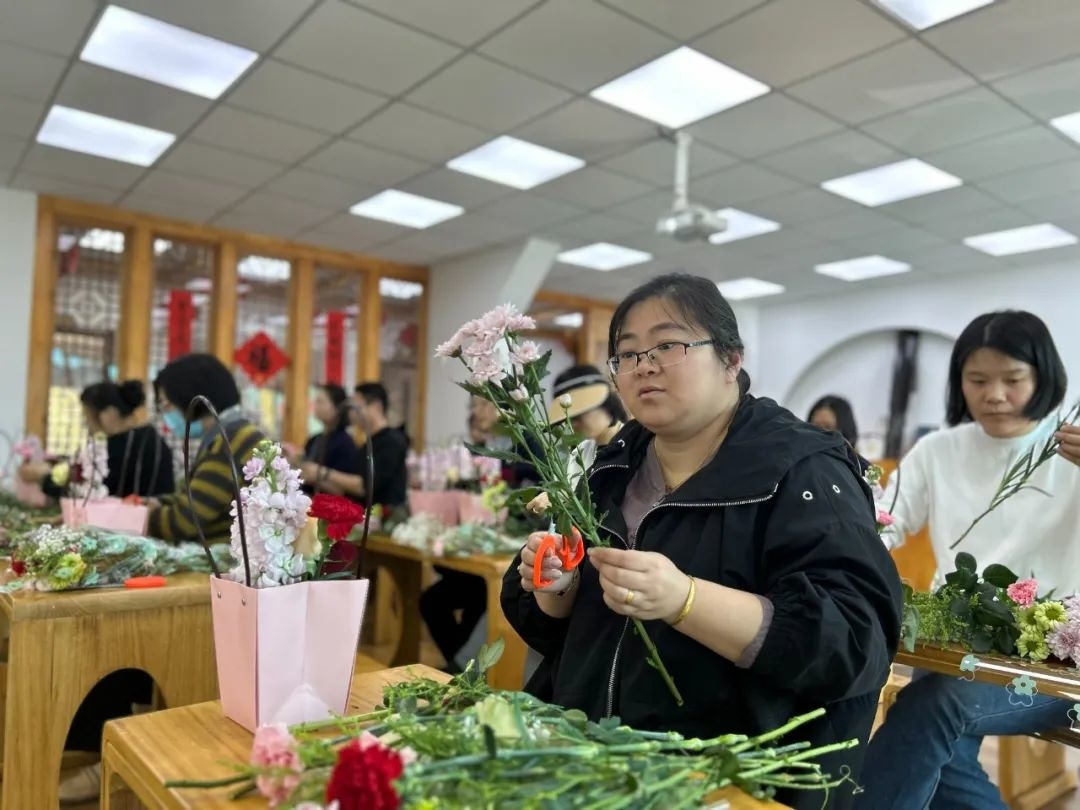 文化厅内,花艺讲师正细致地向家长们讲解插花的基本知识与技巧,从自然美、人文美、艺术美的角度解析花语。学员们根据老师教的插花原理与技巧,自己动手实践,结合创意,完成了一件件赏心悦目的插花作品。