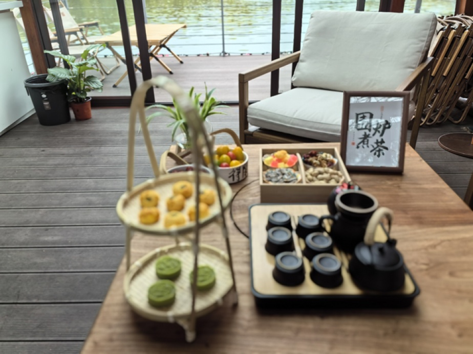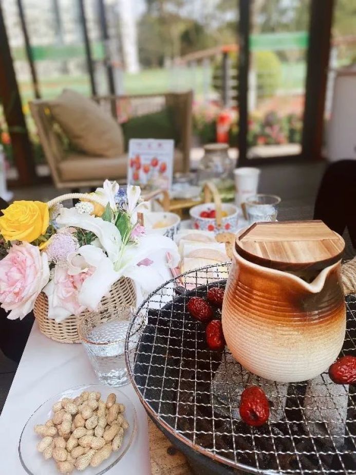 在一片郁金香花海中“围炉煮茶”是一种怎样的体验呢?在上海鲜花港的船坞围炉煮茶里,大家可以品尝到脱化于云南的“火塘烤茶”,将茶水置于炭火上,红薯、大枣、玉米、棉花糖等围壶摆放,谈笑间茶水沸腾,茶香四溢,与熟透的食物香气相融合,给人惬意又幸福的感觉。