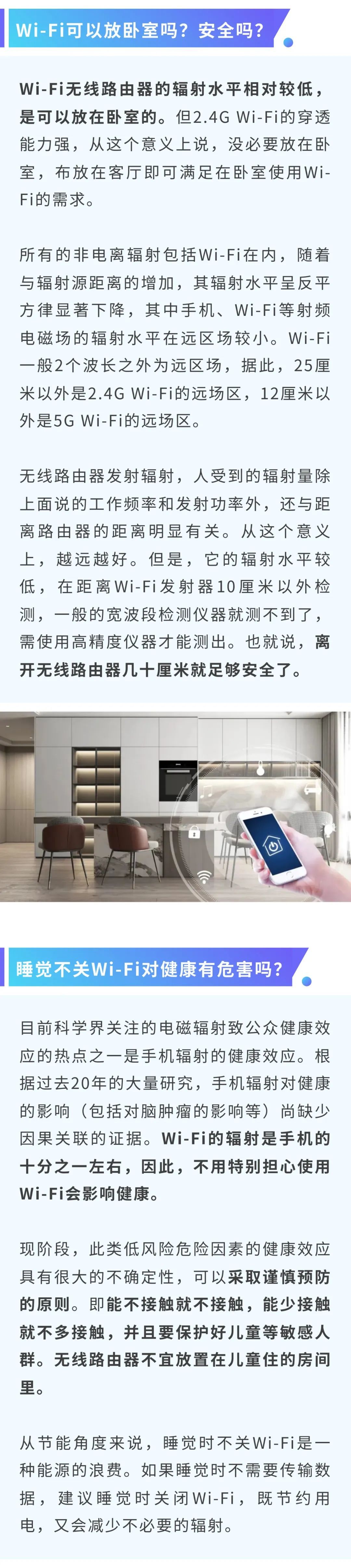 Wi-Fi无线路由器的辐射水平与工作频率、发射功率有关。按照我国工业和信息化部管理部门的要求,一般2.4G Wi-Fi功率不大于100mW,5G Wi-Fi功率一般不大于200mW。手机最大发射功率在2G时代为2W,3G为1W,4G为0.25W,5G为0.25W或1W。Wi-Fi的发射功率是手机的十分之一左右,因此Wi-Fi的辐射是比较小的。