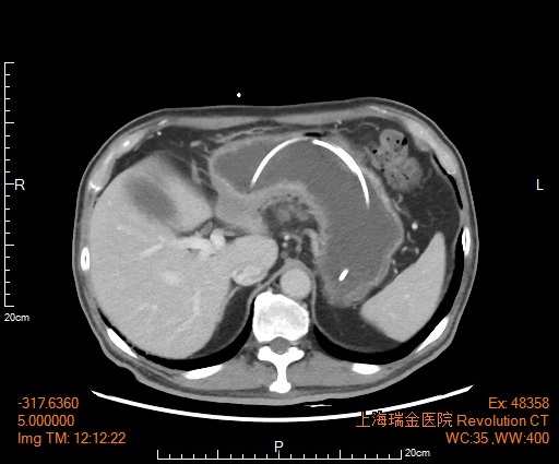 “一吃东西肚子就胀,只能喝点水,最近一个月体重下降了10kg。”见到刘文韬医生时,老沈状态极差。仔细了解情况后,刘医生判断“还是胃部有问题”。果然复查胃镜后情况不妙:胃体-胃窦中部起可见黏膜充血水肿,自发性渗血,有一巨大增生性病变,堵塞了胃腔,整个胃都变形了。病理显示为低分化腺癌,入院后更详细的检查提示老沈已经出现了腹膜、腹膜后淋巴结转移,这种晚期胃癌,立刻做手术可能无法根治。