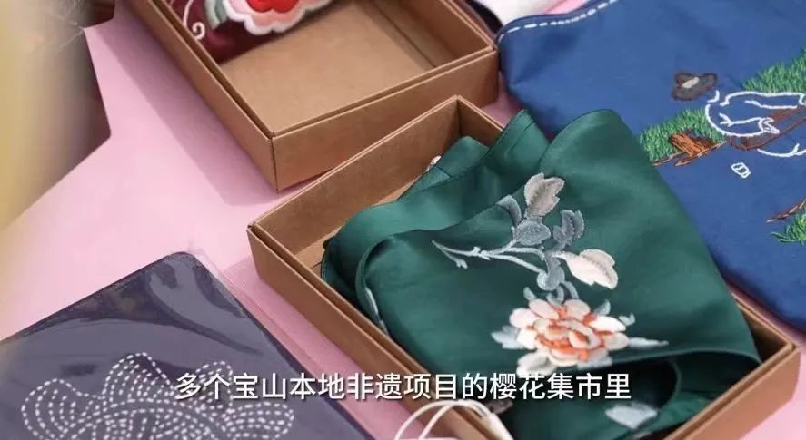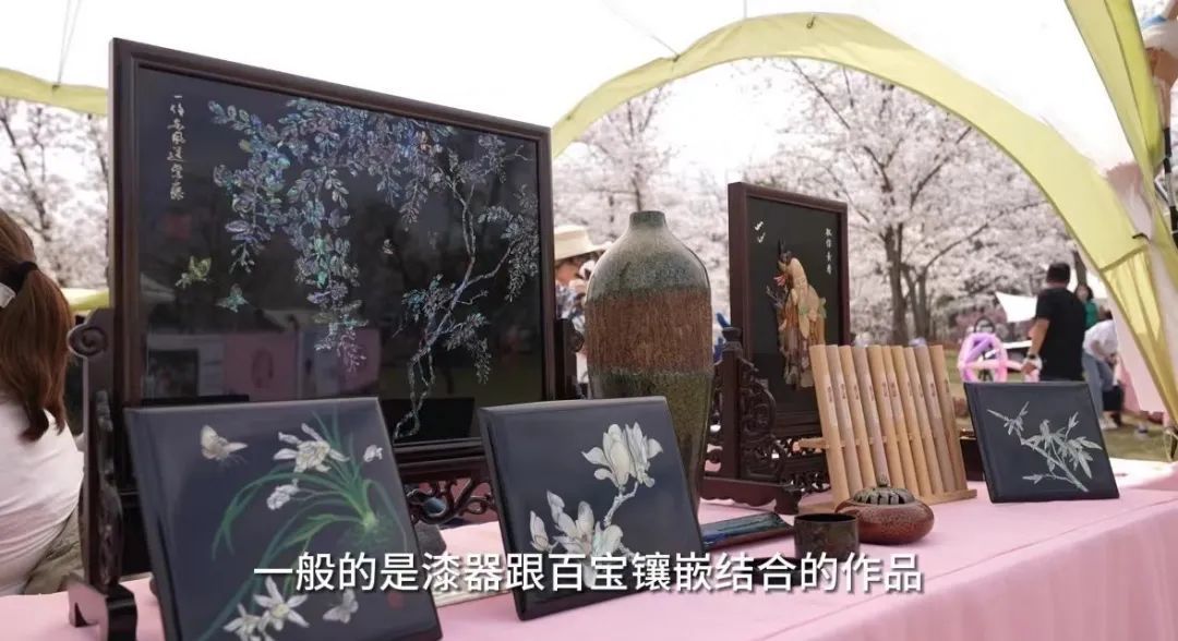 集多个宝山本地非遗项目的樱花集市里,不仅有展览展示,也有美育体验、文创市集等,淞南蛋雕、百宝镶嵌、吴淞面塑等十余个特色非遗项目参与市集,有非遗文创展品展示售卖,更有趣味现场体验活动。