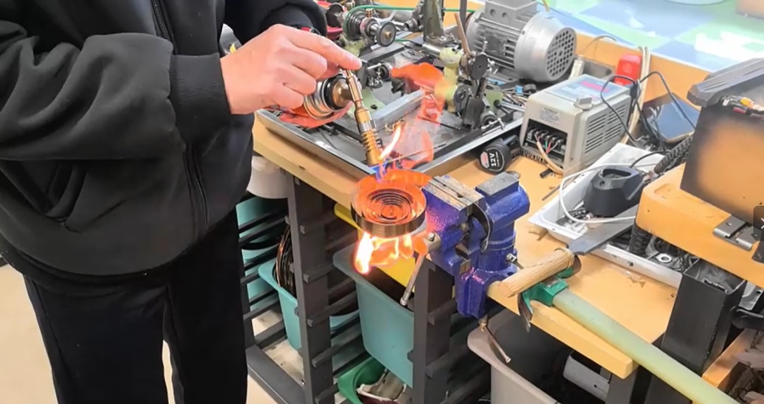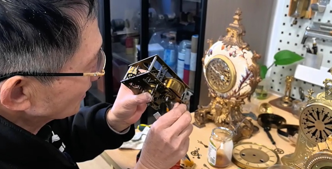 负责机芯修复工作的钟表师陈富春介绍,由于大部分零件严重锈蚀与磨损,自己只能手工复刻。在组装过程中遇到发条断裂,他便用一根新的钢条在机器上慢慢打磨,直到粗细和角度合适。“最后再把零件装回去,也总会遇到些新毛病,这就得拆了重新检查、调试。”陈富春说。