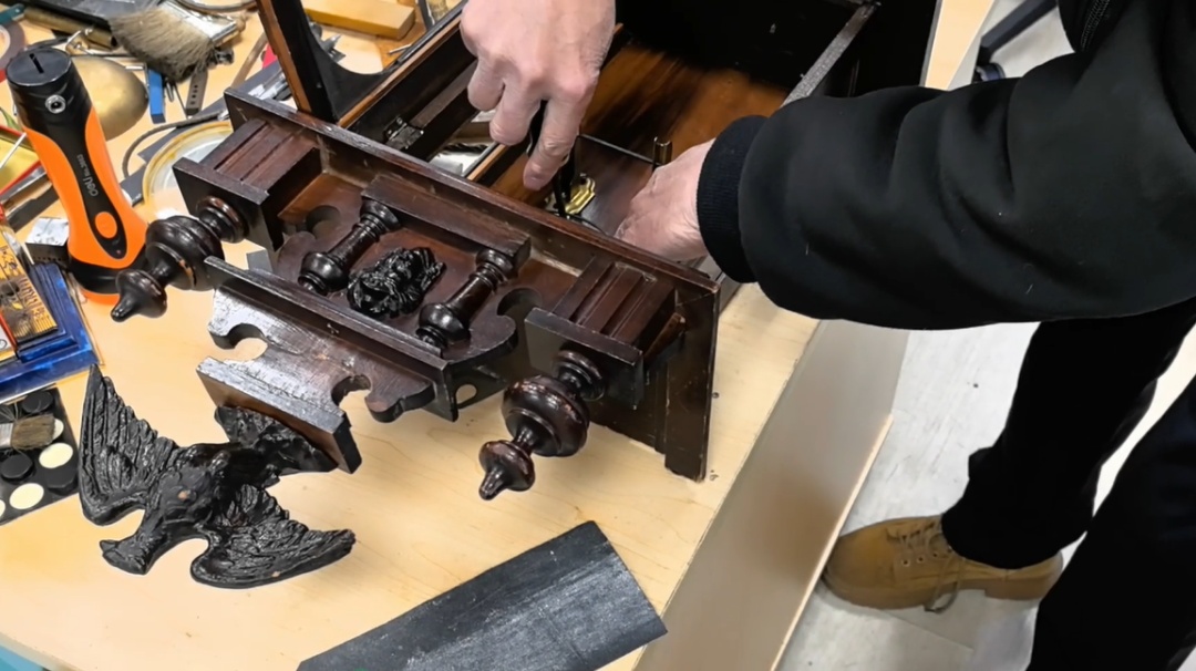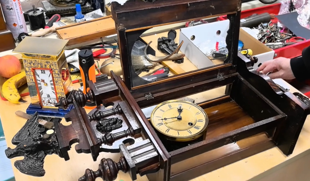 据了解,古钟的修复工作涉及机芯和外壳两个部分,需要钟表师和木匠共同完成。木匠师傅侯利华回忆道,古钟刚送来时零件散乱不堪,修复过程中需要逐一打磨,最大的难度在于没有任何图纸可以参考。为此,他参考了很多网络图片,想象钟表原来的样子,再凭借经验组装起来。