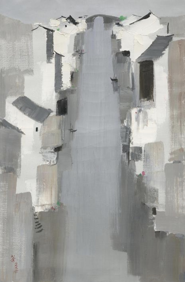 在江南水乡,白墙黛瓦的民居沿河错落分布,一条条蜿蜒曲折的小河如同丝带般穿梭其间,小桥如珠串联起了每户人家。吴冠中老爷爷是江苏宜兴人,他在《忆故乡》这幅画的尽头,画了一座连接两岸的石拱桥,虽然只有寥寥数笔,但也增加了画面的“结构美”和“形式美”,构成了画面的视觉焦点,生动诠释了江南水乡的特色与艺术家的乡愁情怀。
