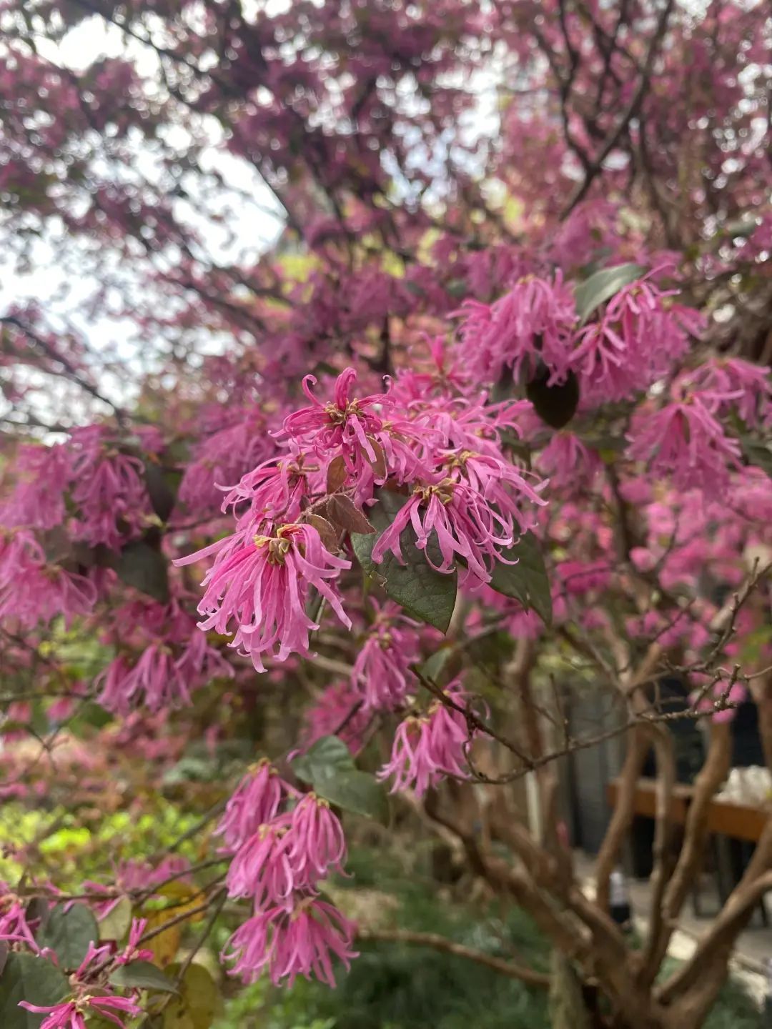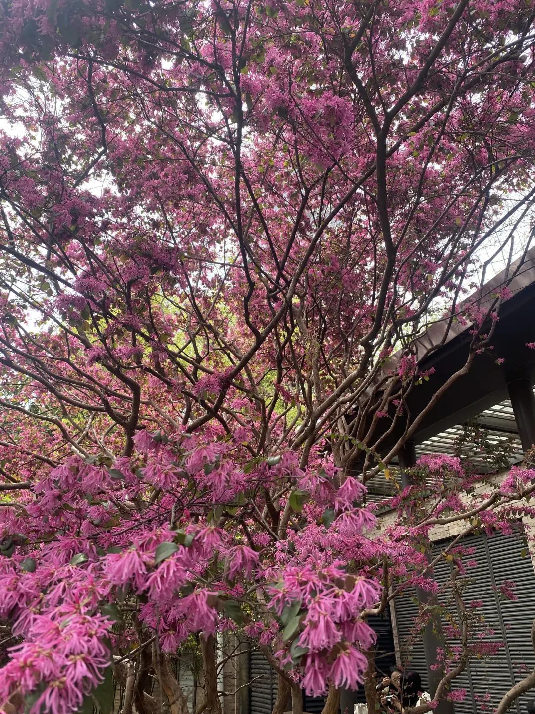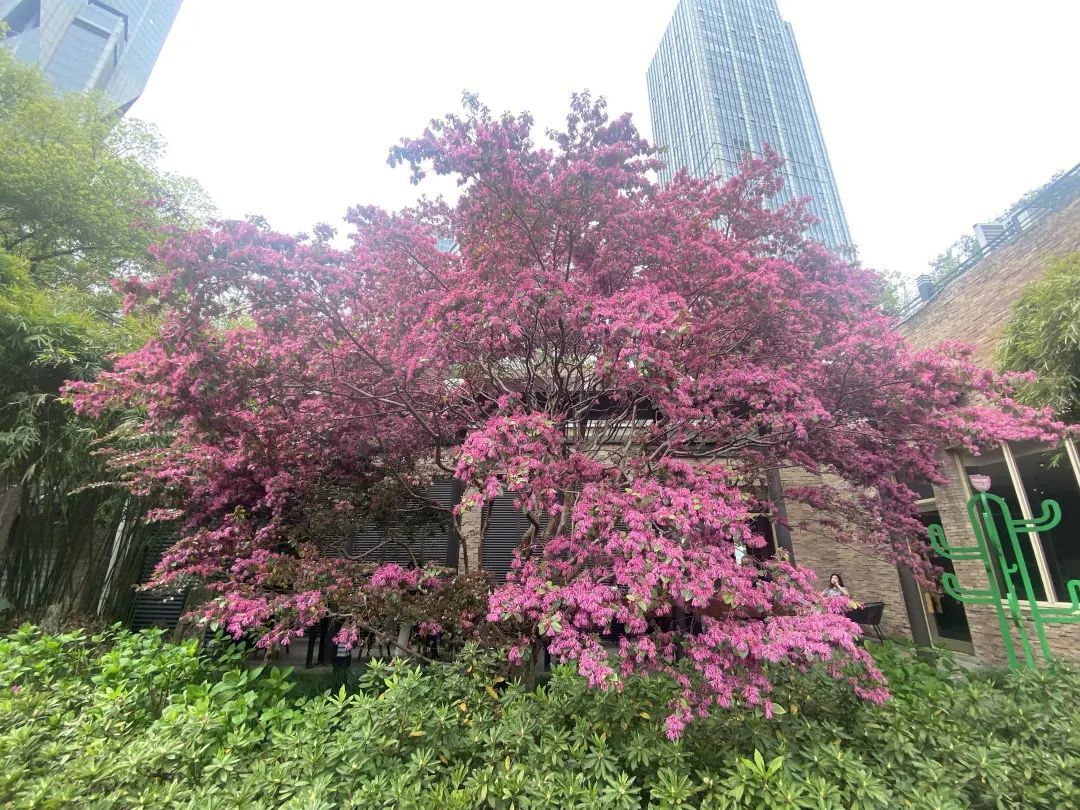 人民公园附近咖啡馆门口的一株红花檵木已经颇有点年头了,粗壮的枝干,一片姹紫嫣红。紫花状如剪碎的丝带般,密密麻麻爆炸式绽放枝头,好不热闹。路过的人都禁不住回头多看几眼,散步的行人和外国游客都忍不住和这一树的紫色烟波合影留念。