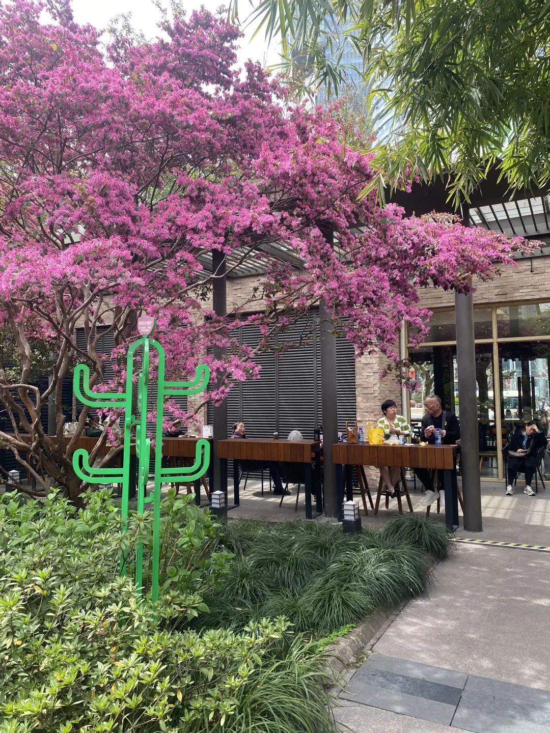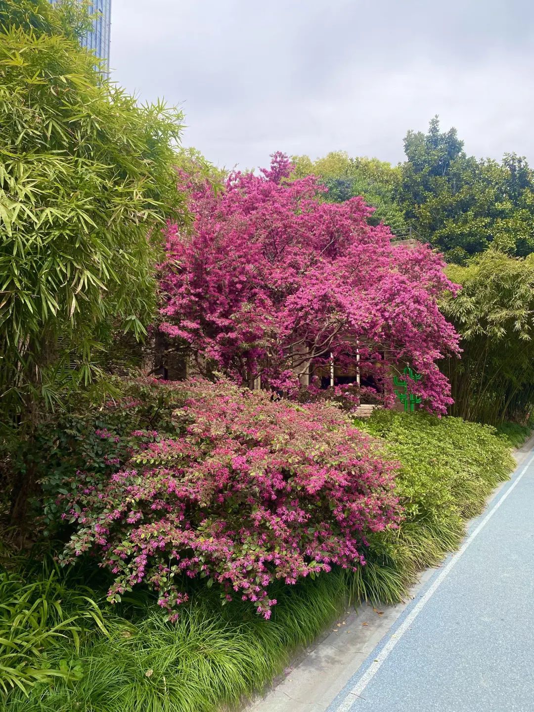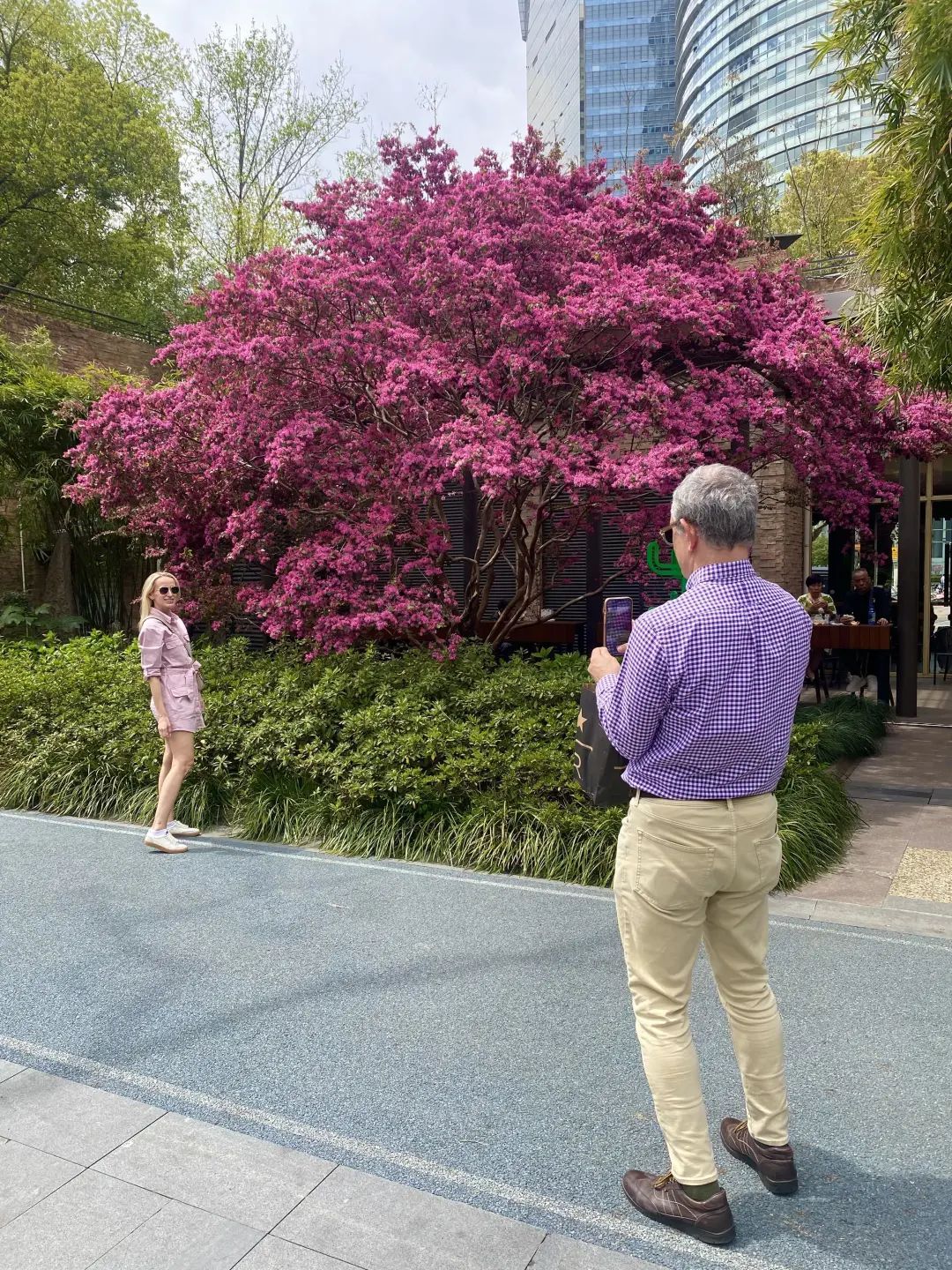 人民公园附近咖啡馆门口的一株红花檵木已经颇有点年头了,粗壮的枝干,一片姹紫嫣红。紫花状如剪碎的丝带般,密密麻麻爆炸式绽放枝头,好不热闹。路过的人都禁不住回头多看几眼,散步的行人和外国游客都忍不住和这一树的紫色烟波合影留念。