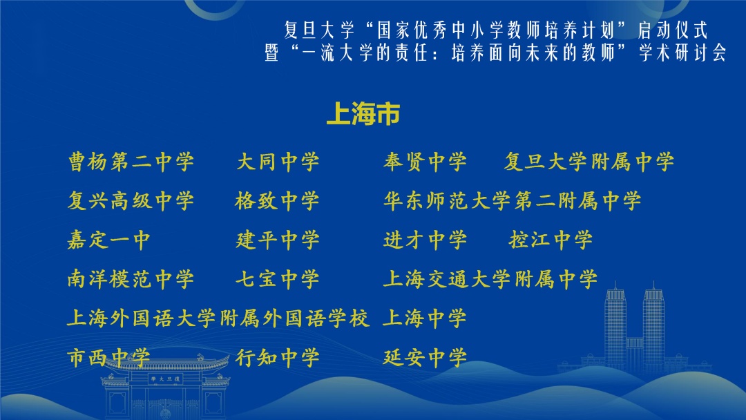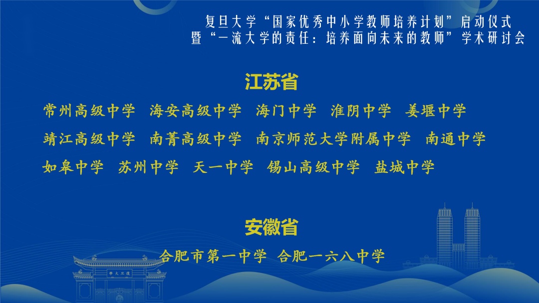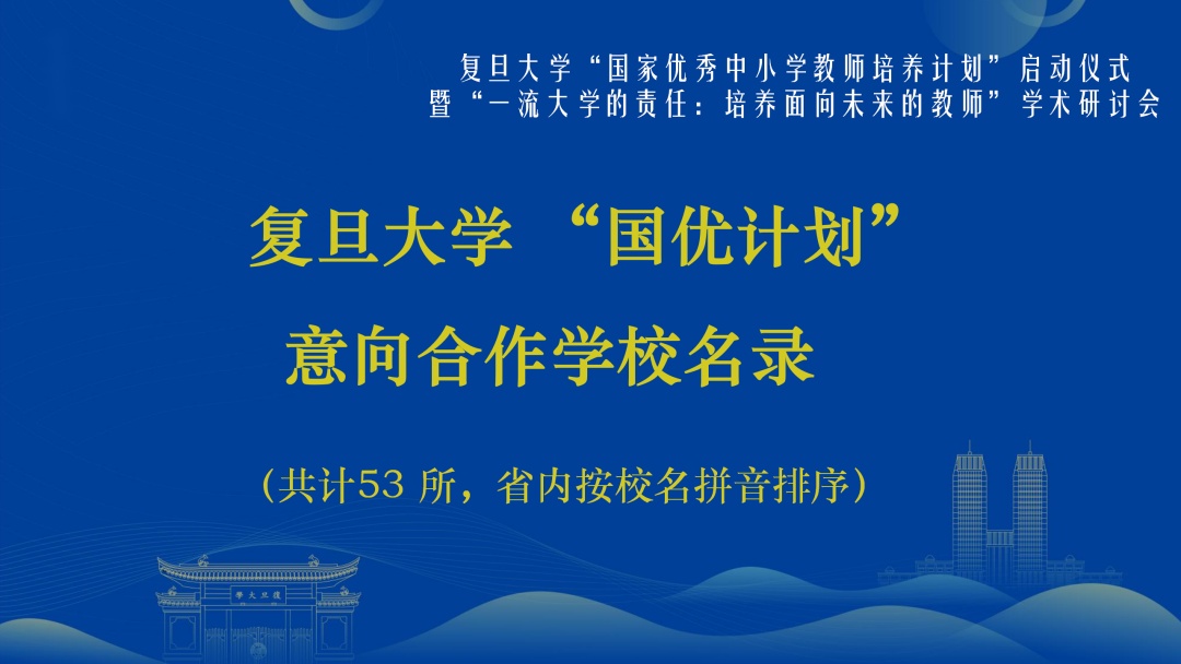 启动仪式上,53所全国知名重点中学成为复旦大学“国优计划”意向合作学校。相关中学相关负责人担任复旦大学“国家优秀中小学教师培养计划”咨询委员会委员。东北师范大学附属中学校长邵志豪、上海市杨浦区教育局局长何劲松作为复旦“国优计划”咨询委员会委员、区县教育局代表发言。