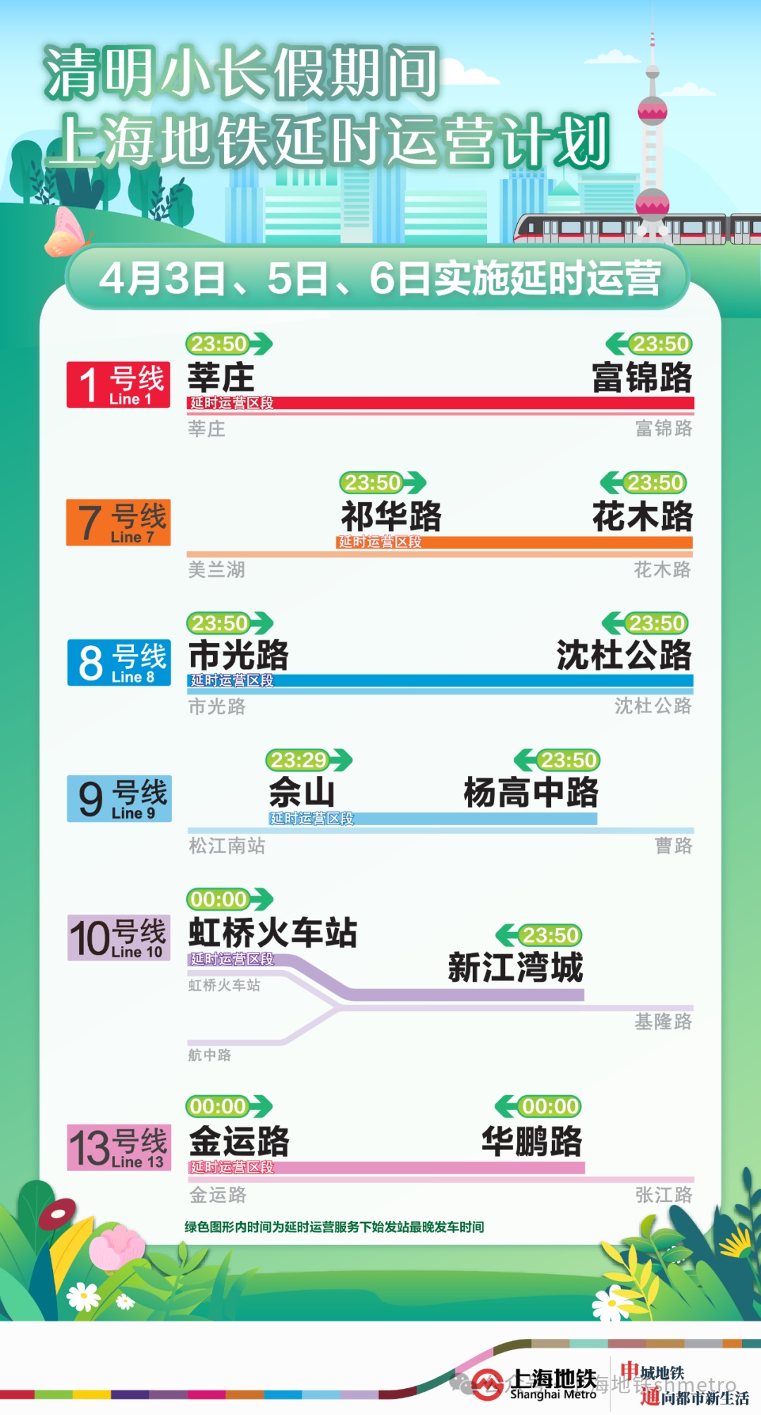 同时,4月3日、5日、6日,上海地铁1、7、8、9、10、13号线执行延时运营方案。