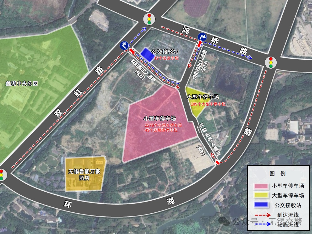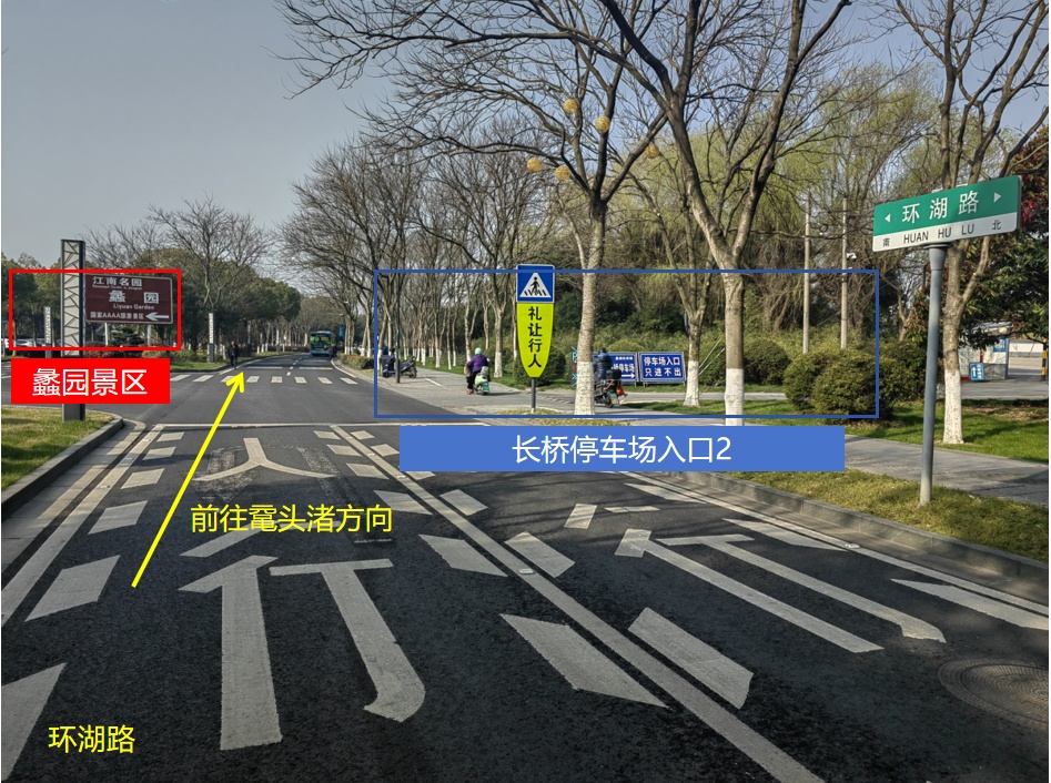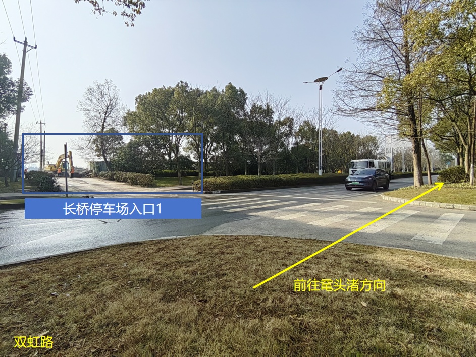 2、私家车辆需注意停车导向标志,在双虹路和鸿桥路东南侧寻找私家车停车场。停车后步行至双虹路上客点乘坐短驳线至鼋头渚。