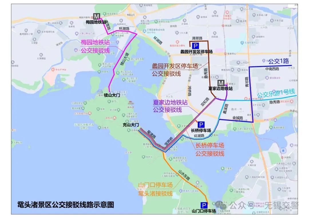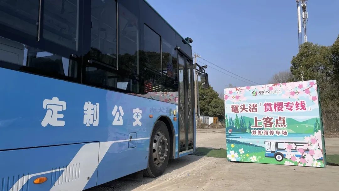 2024年3月16日—4月6日期间,开通夏家边地铁站到鼋头渚充山的赏樱定制线,该线路由地铁夏家边站4号口始发,经蠡溪路、隐秀路、双虹路、鼋渚路至鼋头渚充山大门。夏家边地铁站首班8:30末班16:30,鼋头渚充山大门首班11:00末班17:00。定制公交票价5元。
