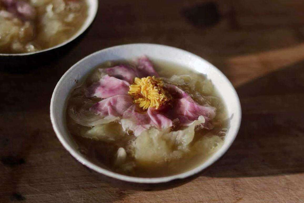 (3)把银耳放入碗内,倒入调好的清汤,上笼蒸至银耳发软入味,取出撒上牡丹花瓣,即可食用。