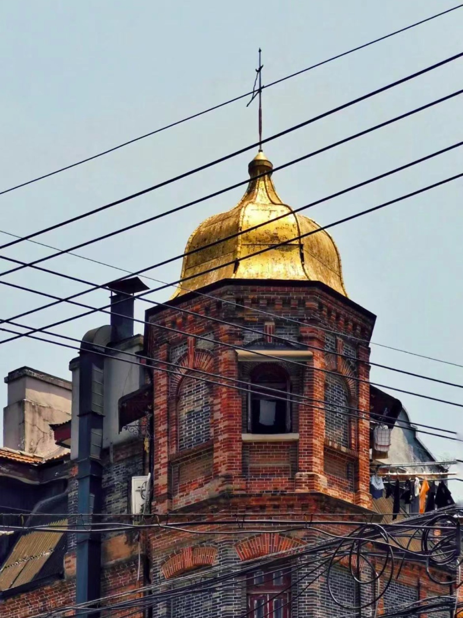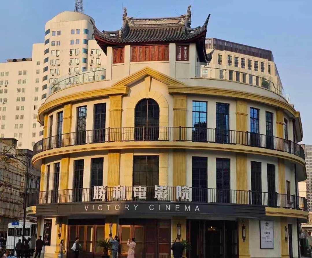 位于乍浦路408号的胜利电影院是一栋三层小楼,立面沿海宁路、乍浦路呈弧形展开。整栋建筑主体外立面为西式建筑风格,但值得一提的是,建筑也融入了中国传统元素。大家有没有注意到?在屋顶上,配有一座飞檐翘角的中式塔楼。这种中西元素的强烈对比,令胜利电影院吸睛无数。