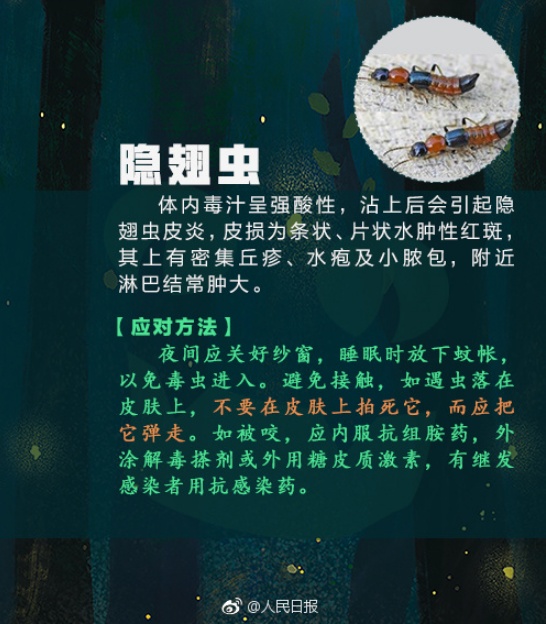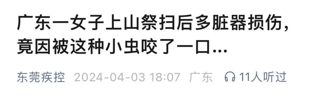 浙江宁波60岁的王师傅 怎么也没想到 3月30日上完坟之后 他竟然住进了医院 而罪魁祸首就是 上坟时吸入的杂质、尘土 祭扫坟墓感染曲霉菌 引发肺炎 “坟头一年没有打扫,堆积了不少枯枝腐叶,还有大片的杂草,我就想着给清扫下。”4月2日,仍在宁波市医疗中心李惠利医院住院的王师傅回忆说:“打扫过程中,我的确被扬起的尘土呛得咳嗽了几声。” 当天回家之后,王师傅就干咳不止,晚上也睡不安稳。到了第三天,他发现自己还出现了胸痛、发烧的情况,便立刻赶到了宁波市医疗中心李惠利医院就诊。 接诊的该院呼吸与危重症医学科医生仔细询问病情后,从王师傅的CT片子上发现,其肺部长出了一个个“小树芽”。 “因为形状特异,怀疑患者患上霉菌性肺炎。”医生告诉记者,考虑到患者肺部感染已影响到他的呼吸功能,血氧饱和度也掉到90%,就将其收治入院。 为了确诊病情,医生给王师傅做了气管镜,发现其气道壁上缀着大量白色菌斑。经过化验,医生确认王师傅感染曲霉菌。 目前,经过雾化吸入和抗真菌治疗,王师傅体内的霉菌已被清除,胸痛得到缓解,血氧饱和度也恢复正常。 医生解释,霉菌喜欢潮湿、温暖的环境,坟地常年无人清理,大量落叶覆盖土壤,气温回暖成了霉菌生长的温床。 当下 正是气温回暖的时候 也是霉菌滋生的季节 过敏体质的人群吸入霉菌后 会引发过敏反应 医生也建议免疫力低下的老年人、幼儿和本身有基础疾病的人在扫墓过程中尽量远离尘土,少接触潮湿腐败的泥土,扫墓过程中最好戴上口罩,穿好长衣长裤。 恙虫活跃,被咬严重致命 出门踏青需留意 清明正值潮湿多雨时节 虫子进入活跃期 如果在外出活动时 发现有虫子叮咬,千万要小心 一旦处理不当 严重时甚至可能致命 近日,佛山市南海区大沥的黄女士和家人一起去山上祭扫回来后,多脏器损伤。 据悉,黄女士祭扫回来后不久,就出现反复发热,体温最高达39.5℃,还伴有头痛、寒战、乏力,全身出现红色的皮疹。 在当地医院住院期间仍反复发热,体温没有下降趋势,逐渐出现呼吸困难,抽血化验结果提示肝脏和肾脏损伤明显。家属感觉情况不对劲,赶紧联系转诊到华工附六院(南海医院)感染科就诊。 住院后,黄女士呼吸困难仍在加重,合并急性肾功能衰竭、呼吸衰竭、肝损伤等多脏器损伤,情况十分危急! 医生详细询问黄女士病史,结合其祭扫后开始出现发热,伴随有皮疹、头痛乏力症状,腋窝、腹股沟多处淋巴结肿大,病情进展快,同时出现多脏器损伤,高度怀疑“恙虫病”。 但令医生感到奇怪的是 黄女士身上没有找到 恙虫病特有的“焦痂” 与患者家属商量后,进行血液二代基因测序检查,24小时后在血液中找到了“恙虫病东方体”的证据,黄女士确诊为重症恙虫病。 所幸处理及时,黄女士在感染科的精心治疗下,体温逐渐下降,呼吸困难逐渐缓解了。复查肝功能、肾功能也恢复了正常,逃过一劫。 天气渐热,警惕恙虫病! 恙虫病是由恙虫携带的东方立克次体感染人体所致的急性自然疫源性传染病。 ▲ 恙虫 恙虫病以高热为主要表现,伴有头痛、畏寒等症状,发热时间较长,最长者超过一个月。患者常同时出现肺炎、肝炎以及心脏和肾脏的损害,因而临床表现比较复杂,往往被市民误以为是感冒发烧,忽略就医或误诊。 恙虫病一般症状较轻,早期及时治疗效果良好,极少死亡。但如果不治疗的话,恙虫病会导致心肌炎、脑膜脑炎和肺炎等严重病变。如果本身有其他基础病或老人延迟治疗的话,预后则会比较差,甚至还有致命的可能性。 防护小知识 怎样预防恙虫病? 专家支招 1、恙虫主要栖息在草丛或灌木中。在广东地区比较活跃的德里纤恙虫,幼虫和成虫平时躲在土壤里,下雨后的清晨、傍晚则会爬到草尖上,这两个时段应避免在草丛灌木中停留,尤其不要坐卧休息。 2、在野外活动时,最好扎紧袖口、裤管口,在暴露的皮肤和裤脚、领口或袖口上喷涂含邻苯二甲酸二甲酯或避蚊胺等成分的驱避剂进行防护。 3、野外活动后,及时拍打衣物,抖落附着的恙虫。换衣洗澡,重点擦洗腋窝、腰部、会阴等皮肤柔软部位。 4、有恙虫叮咬史或野外活动史者,一旦出现发热、焦痂等疑似症状,应尽快到感染科治疗,并告知医生。 到山里踏青被蜱虫叮咬 不可硬拔 近日 华中科技大学同济医学院 附属梨园医院皮肤科门诊 收治一例蜱虫叮咬病例 患者周先生(化姓)到山里踏青,回家后感觉右腿腿肚子外侧发痒,仔细一看,皮肤上有个小黑点,有头有爪子,还在微微动弹。他试着用镊子拔,却怎样都拔不下来,这才赶到医院处理。 ▲ 资料图,图源:央视新闻 “幸亏患者没有自己直接拔掉虫子!”医生介绍,叮咬周先生的是蜱虫,叮咬人体后,会将口器深深扎根到皮肤里吸血,同时传播病原体,可能引发出血热、森林脑炎、莱姆病等疾病。 4月~10月份是蜱虫多见季节 蜱虫主要带有病毒 人体被虰咬后感染可引起 脑神经反应和出血症状 严重者可致命 广东省疾控中心消毒与病媒生物预防控制所副所长蔡松武介绍,人被受感染蜱虫叮咬,可能导致斑疹热、Q热、森林脑炎、出血热等81种病毒性、31种细菌性和32种原虫性疾病。某些蜱虫在吸血过程中涎液分泌的神经毒素可导致被咬者肌肉麻痹,严重的呼吸衰竭而死亡,这就是“蜱瘫痪”。 南方医科大学中西医结合医院急诊科负责人沈宏友介绍,蜱虫不吸血时,最小的细如米粒,吸饱血
