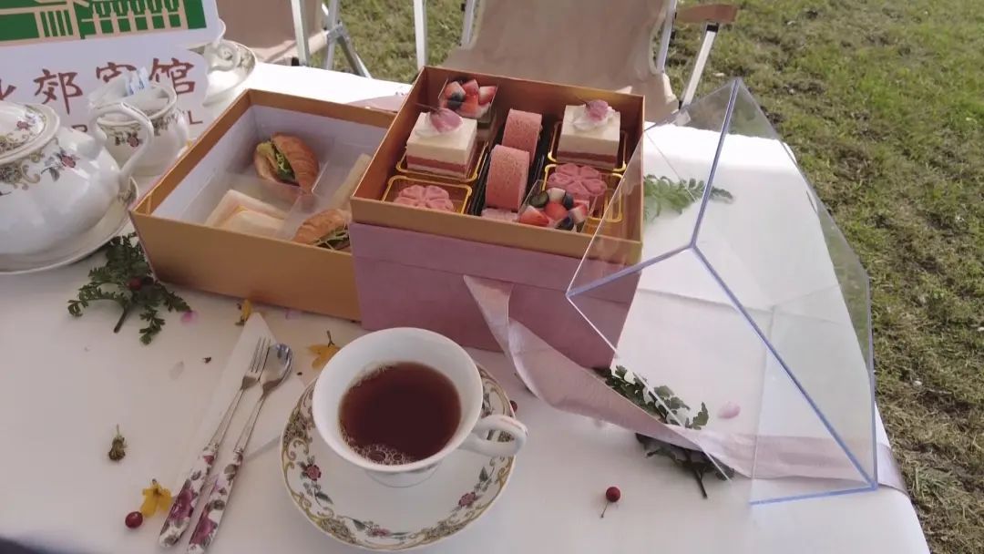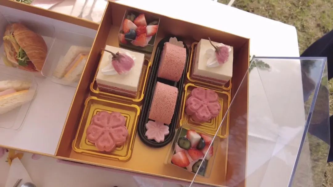 野营帐篷下,樱花系列糕点也很是精美,粉色的花系,不同的款式,让人不忍入口。品着香醇的红茶,配着时尚的精美小点,别有情趣和浪漫。