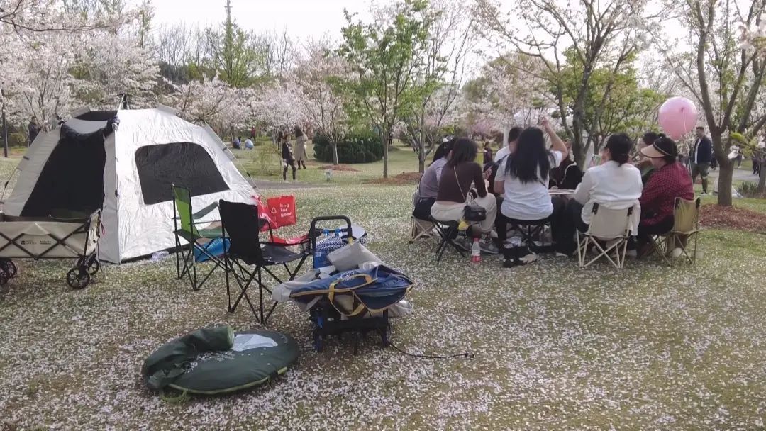 春光明媚,微风轻抚,这几天,在衡山北郊宾馆的大草坪上,市民游客在这里搭起帐篷露营。草地旁的樱花已经盛开,朵朵樱花挂满树枝,争相斗艳。微风吹拂,漫步在草地鲜花中,沐浴在阵阵樱花雨中,恍如童话般的梦境,触摸春天的美好。