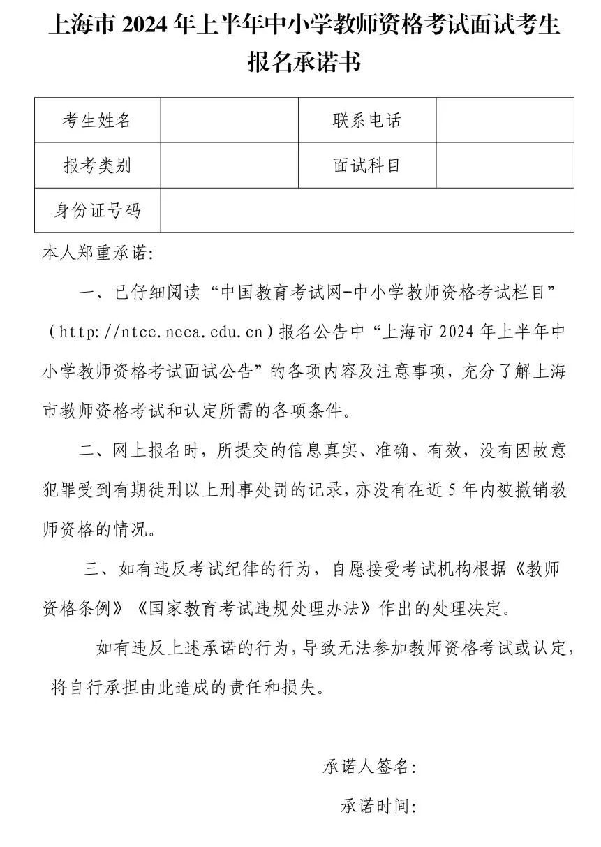 (一)考试当日,考生入场时必须递交《上海市2024年上半年中小学教师资格考试面试考生报名承诺书》(以下简称《报名承诺书》,详见下方)。如因考生在报名时填报虚假信息或不符合报考条件等原因造成面试、认定等后续环节不能完成,一切后果由考生承担。