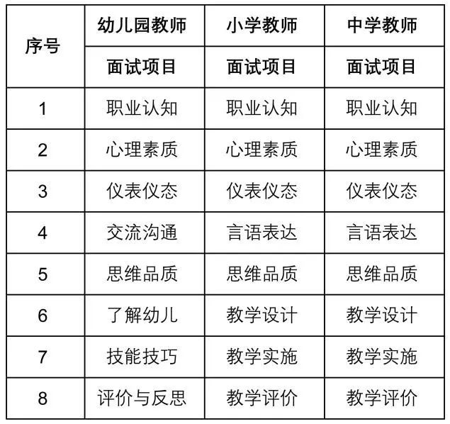 各学段教师资格考试面试项目具体如下(中职教师面试项目同中学教师):