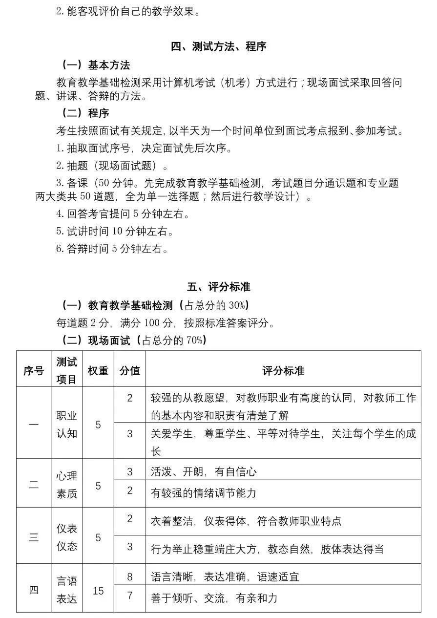 1.面试采取结构化面试、情境模拟等方式,通过备课(或活动设计,或科目考试+教学设计)、试讲(或演示)、答辩(或陈述)等环节进行;