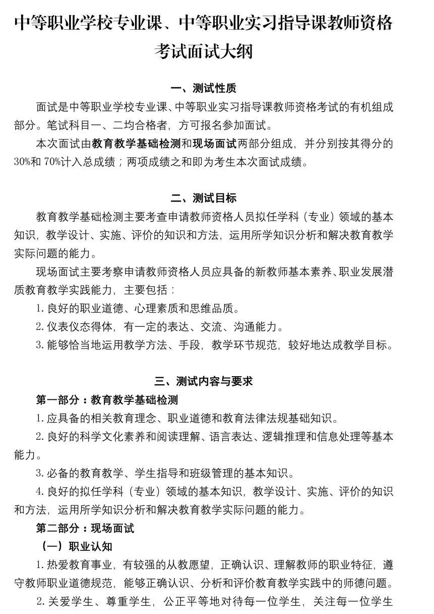 幼儿园、小学、初中、高中及中职文化课教师资格考试面试大纲请登录中小学教师资格考试网(ntce.neea.edu.cn)查询。中职专业课和中职实习指导课教师资格考试面试大纲(详见下方)。