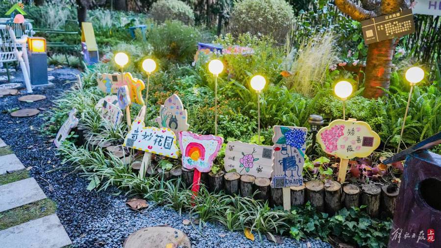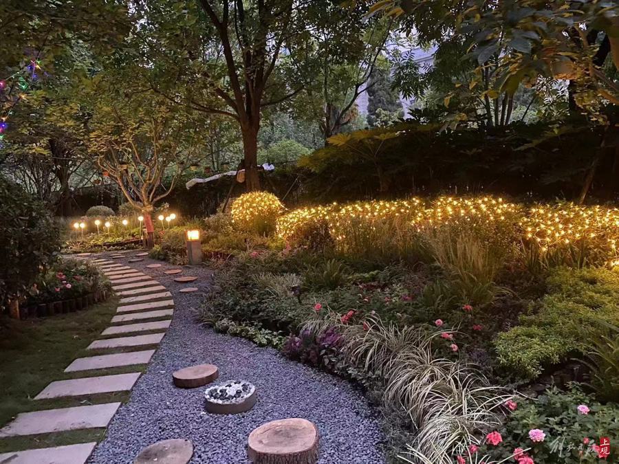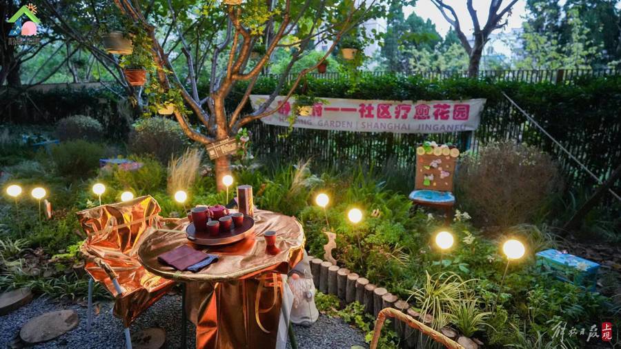 静安区福邸小区,靠近最后一排的居民楼下,有个长条形的小花园,居民为其起名“疗愈花园”。眼下正是“疗愈花园”风景最好时。绿树遮蔽下,曲径通幽,丛丛绿草、点点小花;夜晚,草丛中亮起点点灯光,光影摇曳,好生有趣。