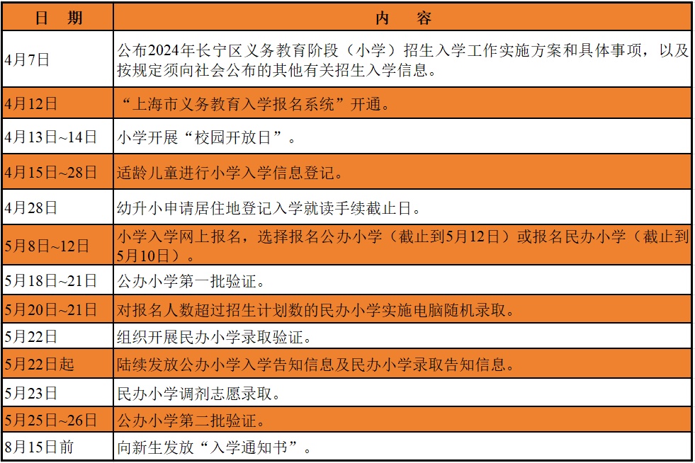 4月15日—4月28日,在本市入园(所)的适龄儿童家长通过幼儿园登记儿童入学信息,获取《上海市小学入学信息登记表》和“入学报名告知书”。未在本市入园(所)的适龄儿童家长可通过区指定方式登记儿童入学信息,获取《上海市小学入学信息登记表》和“入学报名告知书”。具体登记方式及要求,请关注“上海长宁区门户网站 教育局(www.shcn.gov.cn/cnjy)”上公布的《2024年长宁区义务教育阶段(小学)招生入学问答》。