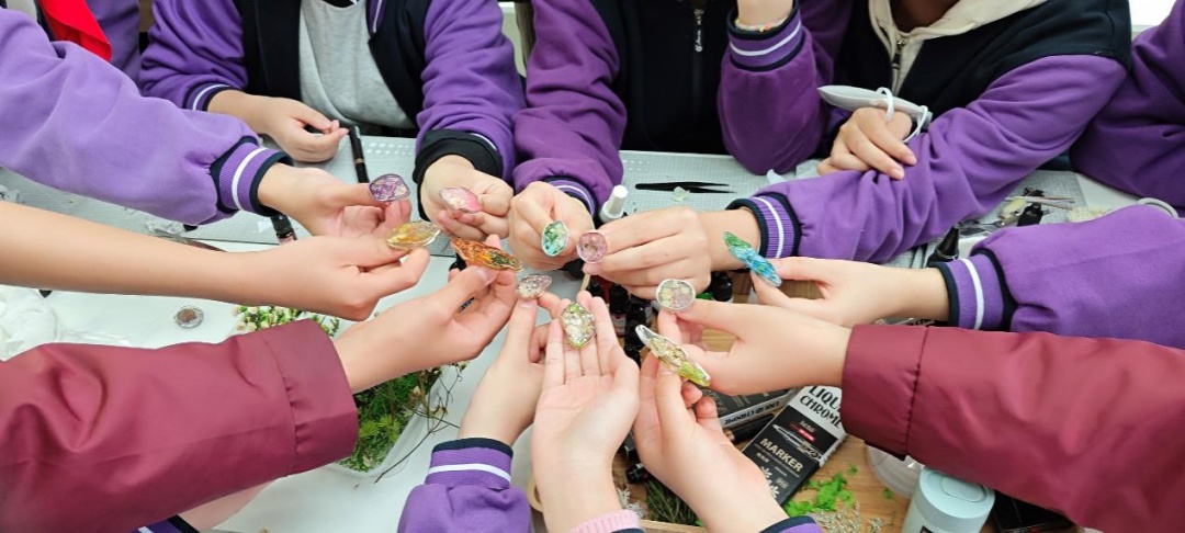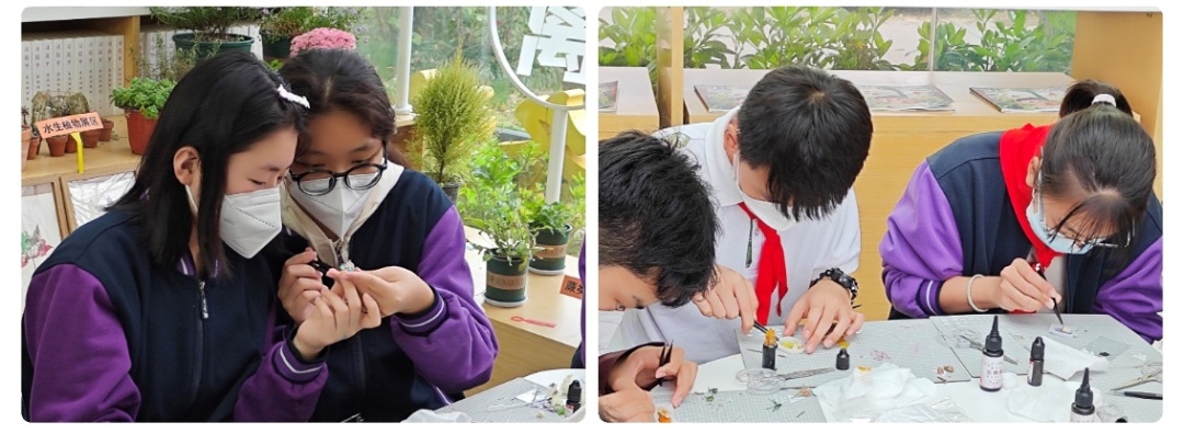 学生们在老师的指导下,充分发挥创意,将手中的花朵与滴胶相结合,创造属于自己独一无二的干花艺术品。