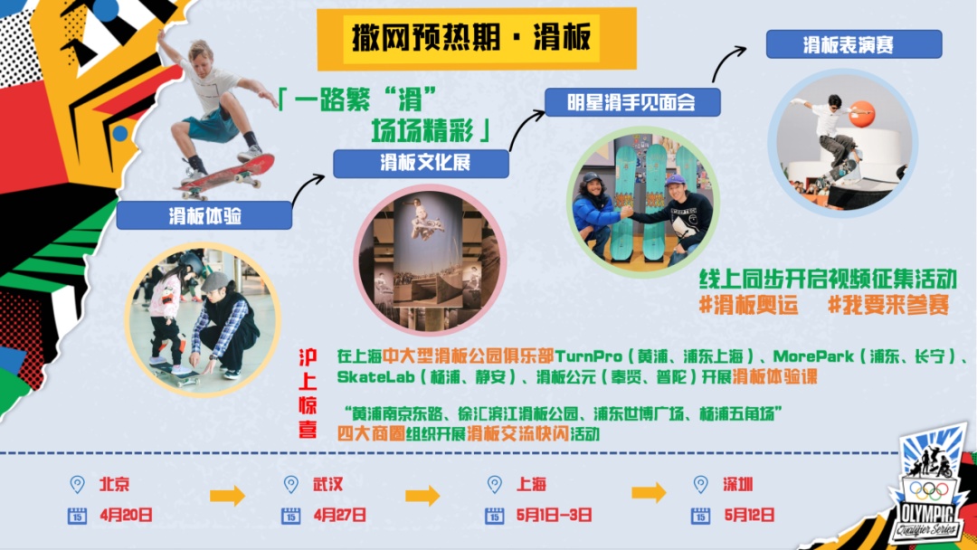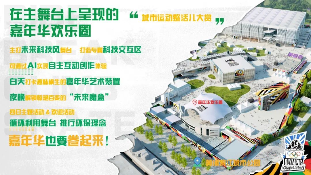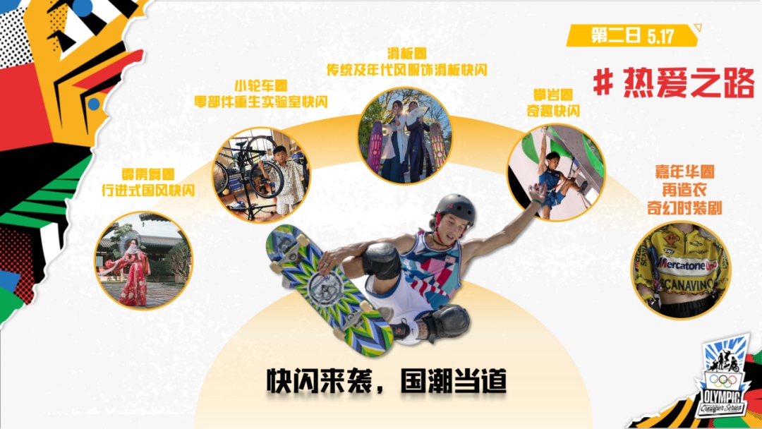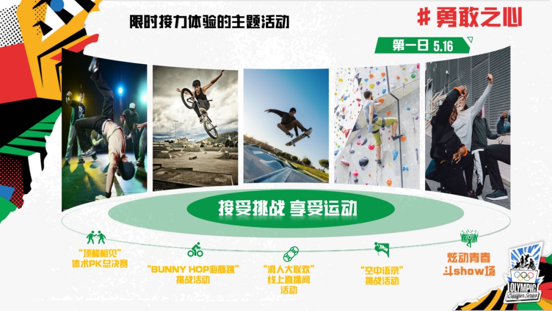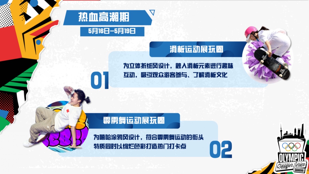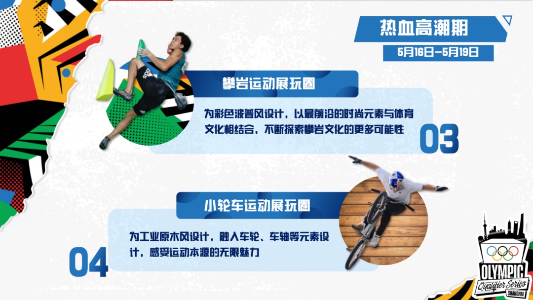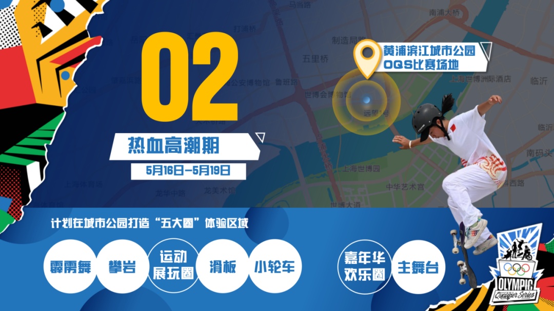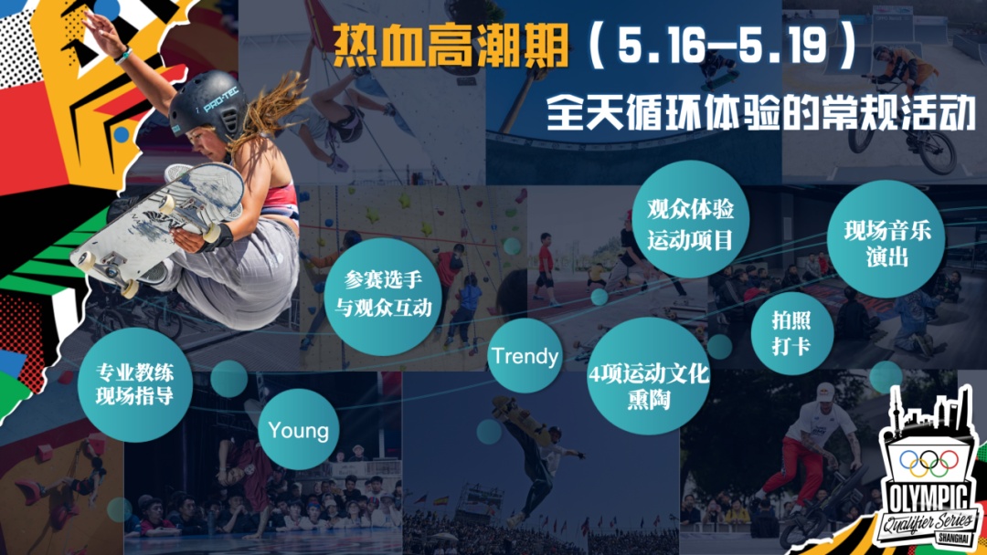 热血高潮期为5月16日至19日。届时将在城市公园打造“五大圈”体验区,包括滑板、霹雳舞、攀岩和小轮车的ABCD运动展玩圈,以及嘉年华欢乐圈。在4项运动展玩圈中,将开启全天循环体验的常规活动。除常规活动外,赛事期间每天将以不同的主题设计限时接力体验活动。