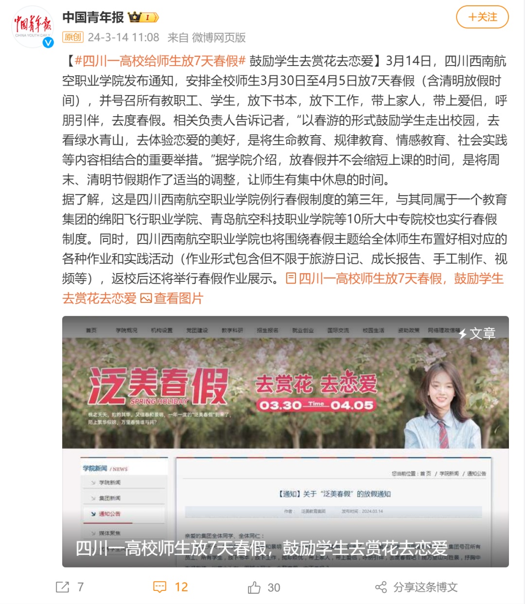 “春假不在于时间长短,而是能够让大学生有更多亲近大自然的契机和意愿,使得学习生活节奏放慢,身心得到平衡,这对学生也是一种全方位的教育和引导。”