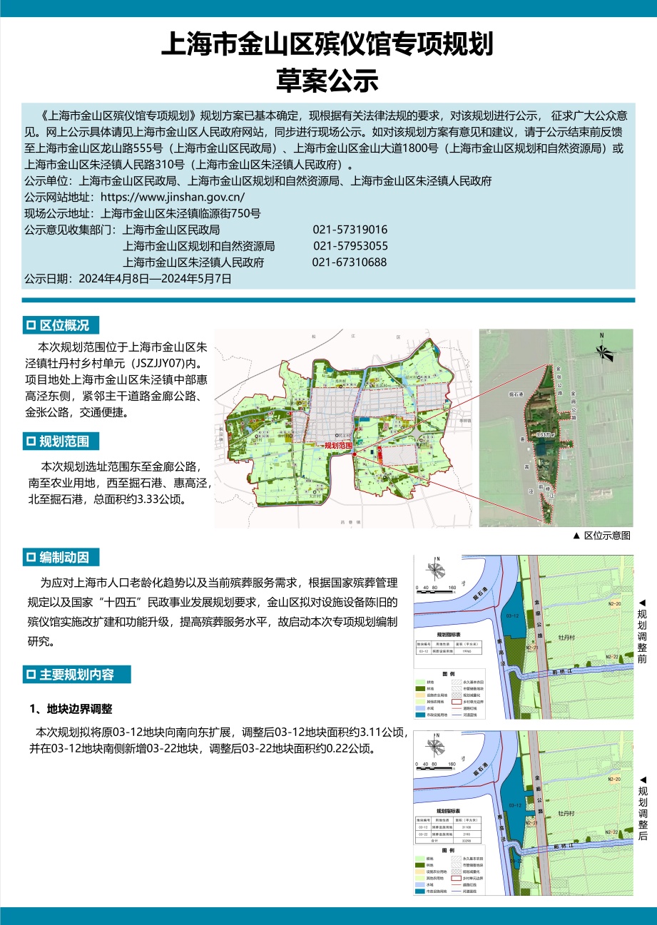 《上海市金山区殡仪馆专项规划》规划方案已基本确定,现根据有关法律法规的要求,对该规划进行公示, 征求广大公众意见。