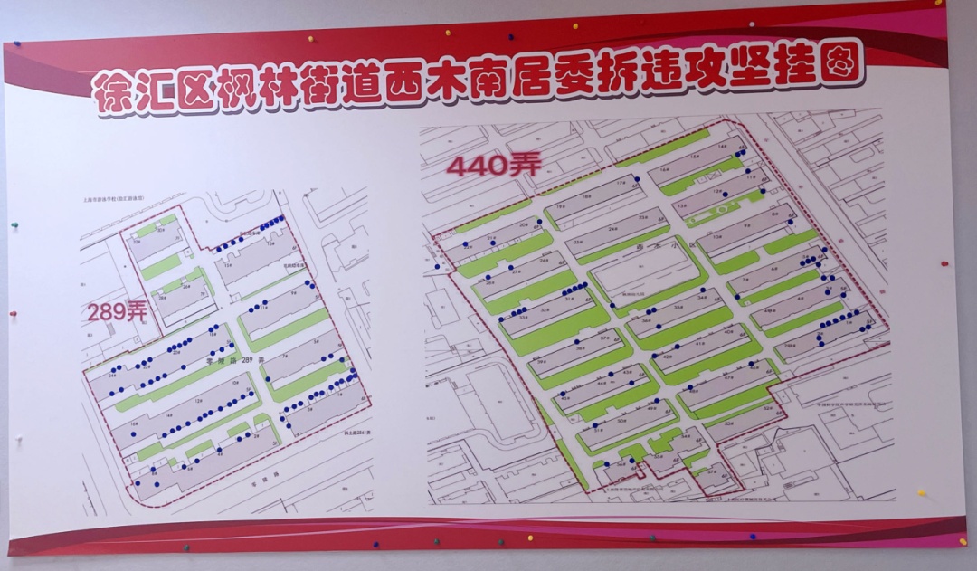 首当其冲的就是拆违。经过排摸,西木南居民区,违建72处,水斗48个,破墙开门、开窗170处,悬空鸽棚3个,外立面挑窗近20处。“这些违法搭建中,80%的工作体量都在零陵路某弄。”马姗颖回忆,由于种种原因,这里曾一度没有物业管理。“三驾马车”商讨后,一致决定在这个最难的点上打开拆违的突破口。