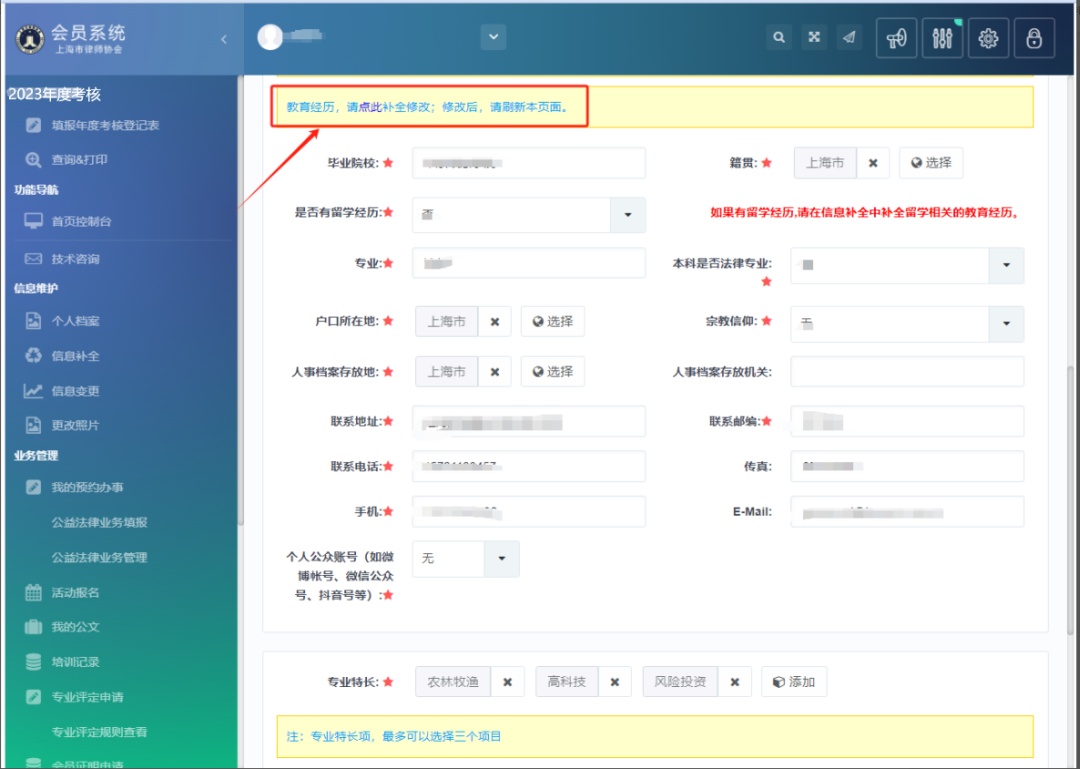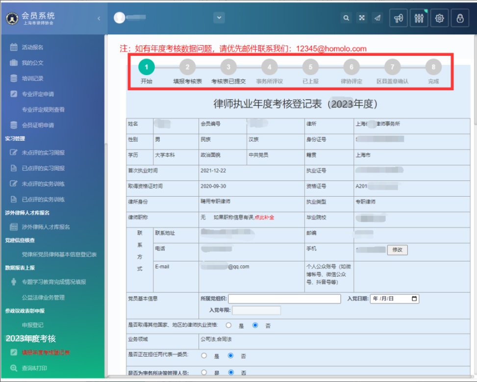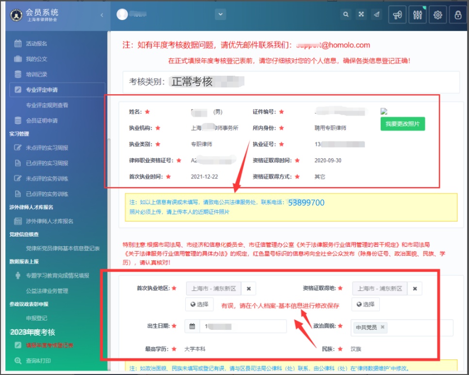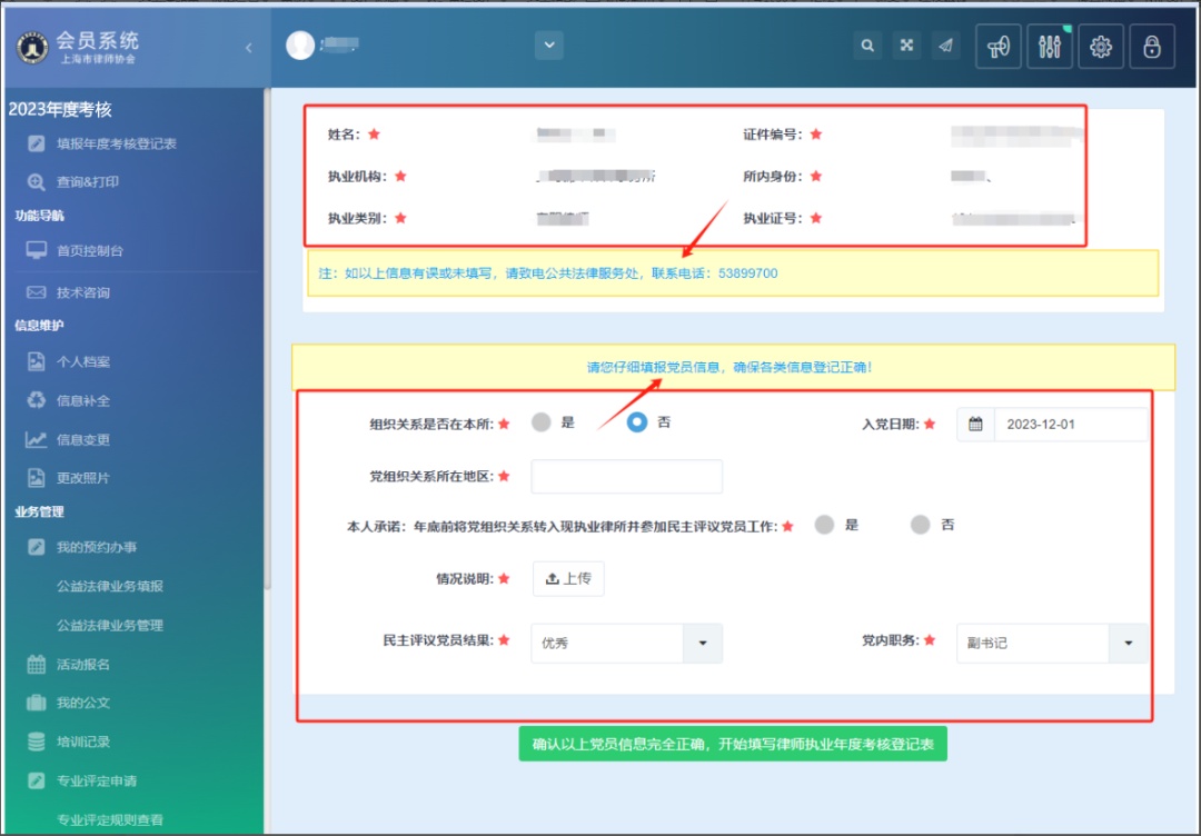 正常考核的律师先进行选择“考核类别”后正常进入信息补全填报页面。如下图所示: