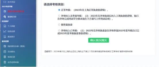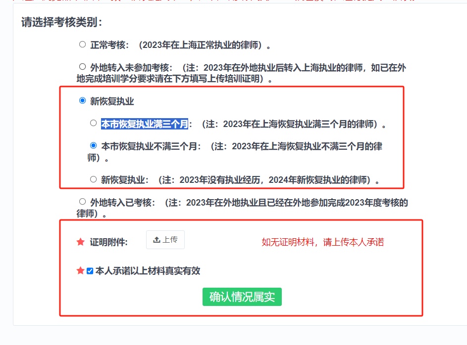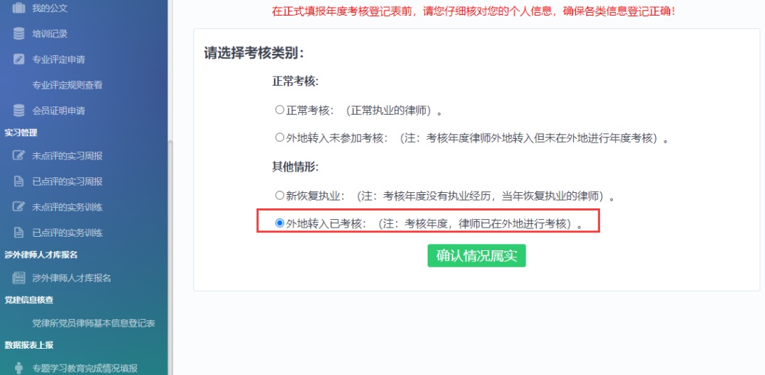 除新执业律师外(其他类型详情请见后面分类)的律师请按照实际情况选择【考核类别】,选择完成后点击“确认情况属实”。