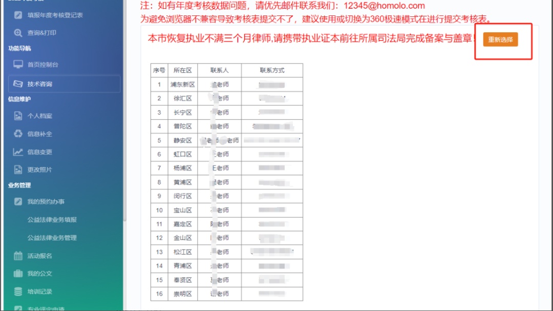 注意:如选择错误,可点击【重新选择】,律师可重新进行选择考核类别。