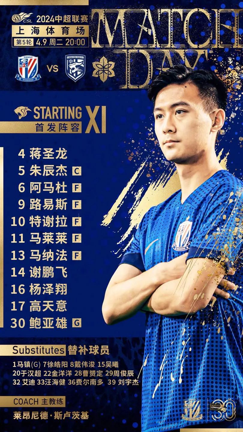 上海申花首发:4-蒋圣龙、5-朱辰杰、6-阿玛杜、9-路易斯、10-特谢拉、11-马莱莱、13-马纳法、14-谢鹏飞、16-杨泽翔、17-高天意、30-鲍亚雄