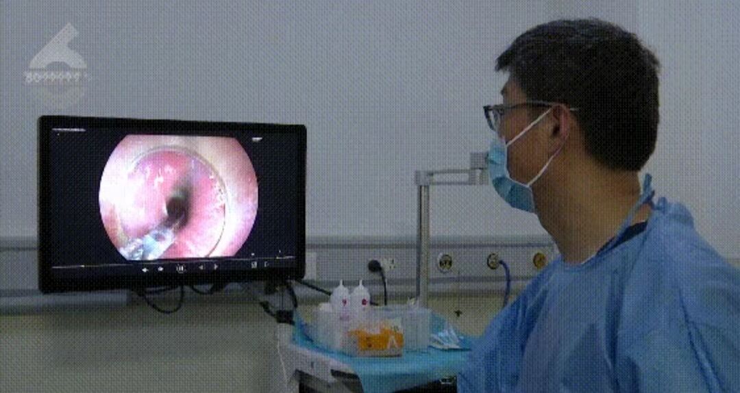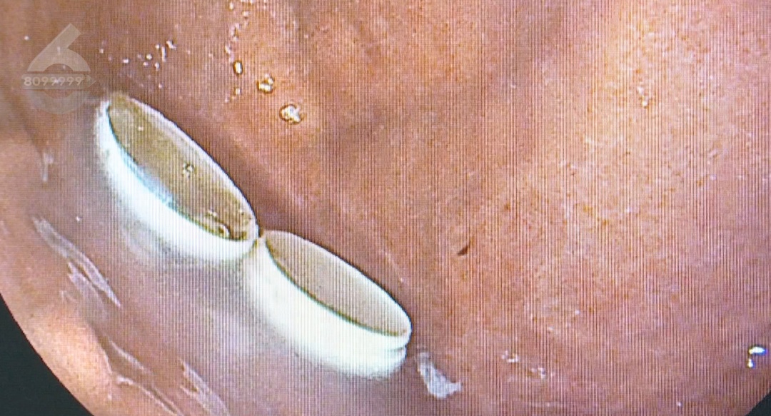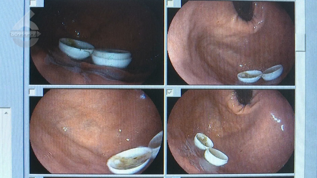 了解患者情况后,医生立即安排胃镜检查,发现患者误食的塑料球壳直径约2厘米,经过肠胃蠕动已经分离成了两瓣。