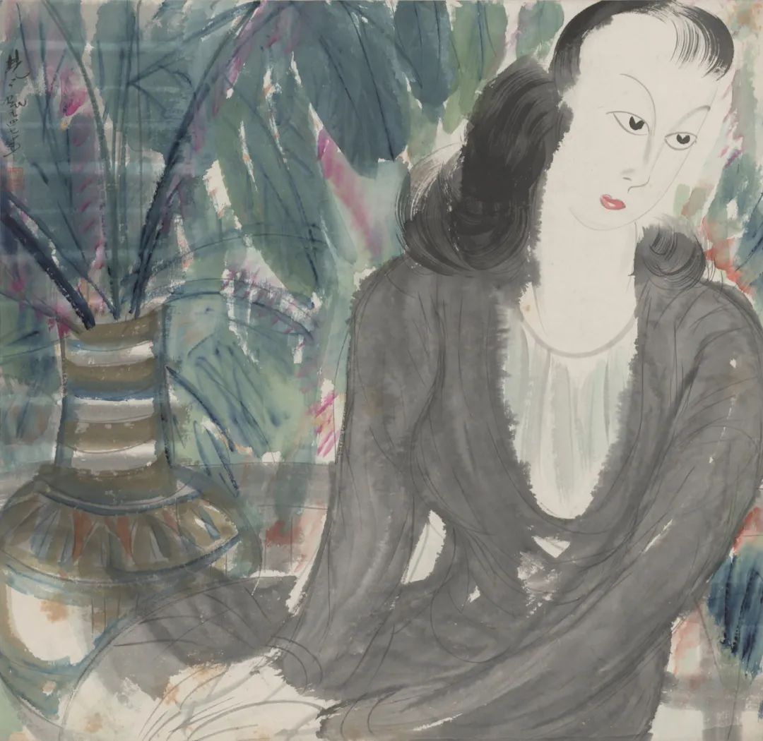 画家以传统的流利细致线条勾勒颜面,用糅合了西画画刷特征的粗重笔触表现身着暗色衣物的躯体;又以色入墨,晕染仕女衣衫,通过笔触与墨色的变化,呈现仕女身躯的起伏动态。简洁凝练的线条与色块体现了画家对抽象构成图式的探索。画面采用方纸布阵,中近距离取景,背景以饱含水分的蓝、绿色填满,背景虽满,但色彩繁而不乱,色块之间露出的底色恰如透过花叶的亮光。