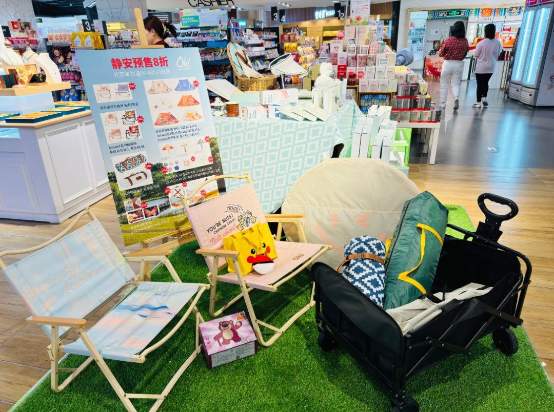 记者注意到,Olé精品超市静安嘉里店内专门设置了踏青出游单品区,除了形形色色的零食饮料外,帐篷、野餐垫、风筝、折叠椅等户外用品一应俱全,可享8折优惠。