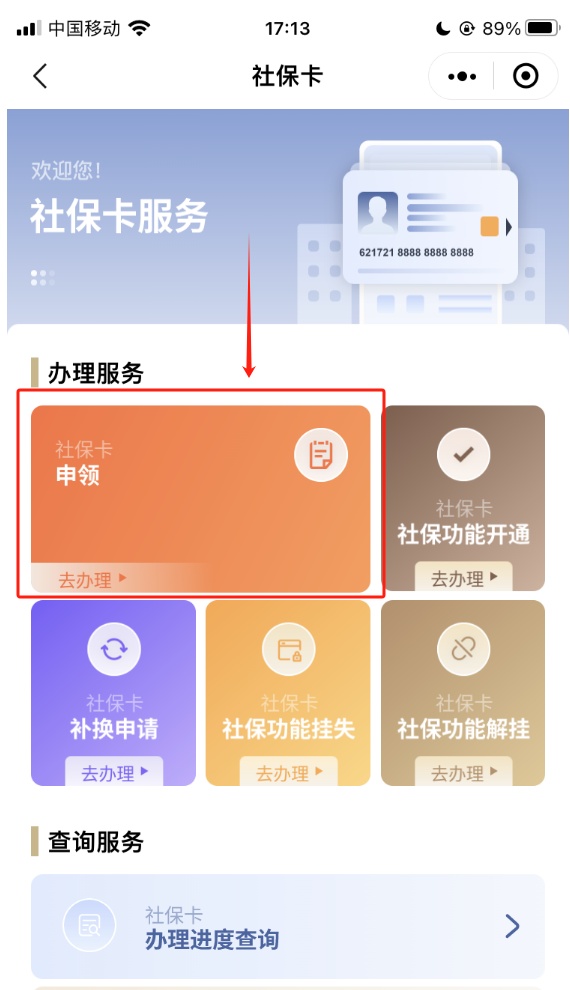 1.在“社保卡服务”页面的“查询服务”栏下,选择“办理进度查询”即可一键查询办件进度。