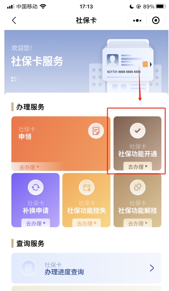 2.成功领取社保卡后,在“社保卡服务”页面选择“社保功能开通”,足不出户即可开通社保功能,还可进行社保功能挂失、解挂、补换等操作哦。