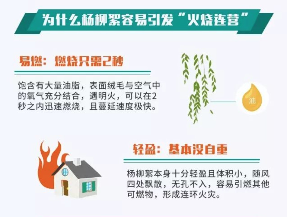 由于杨柳絮中含有大量油脂,一旦遇到明火,极易燃烧,且蔓延速度快。