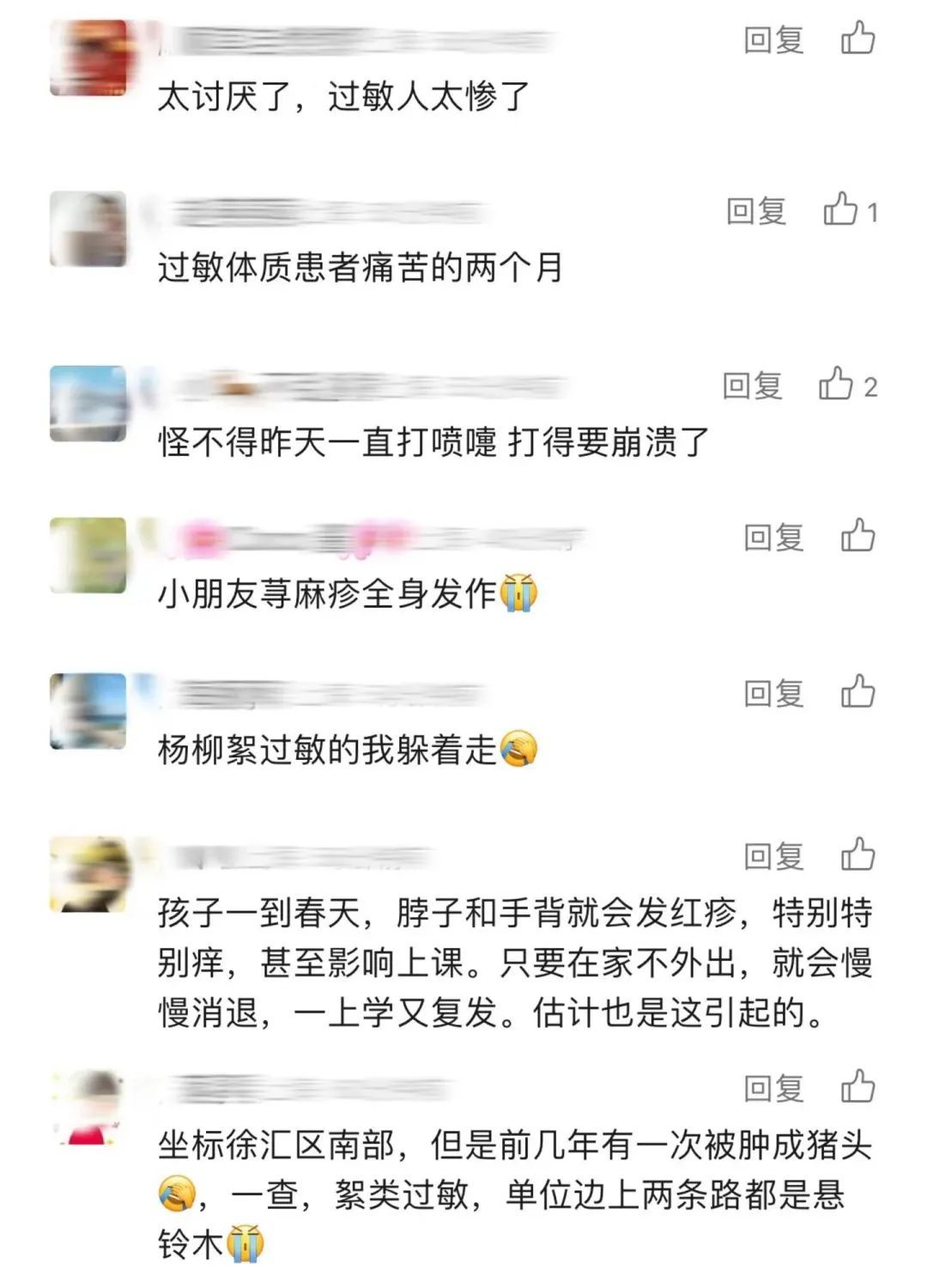 上海春天飘舞的植物毛絮主要来自悬铃木、杨树、柳树。柳树、杨树的毛絮是它们的种子,悬铃木的毛絮主要是它的果毛。在果毛脱落的同时,悬铃木新生的雄花序也会散落一定量的花粉。