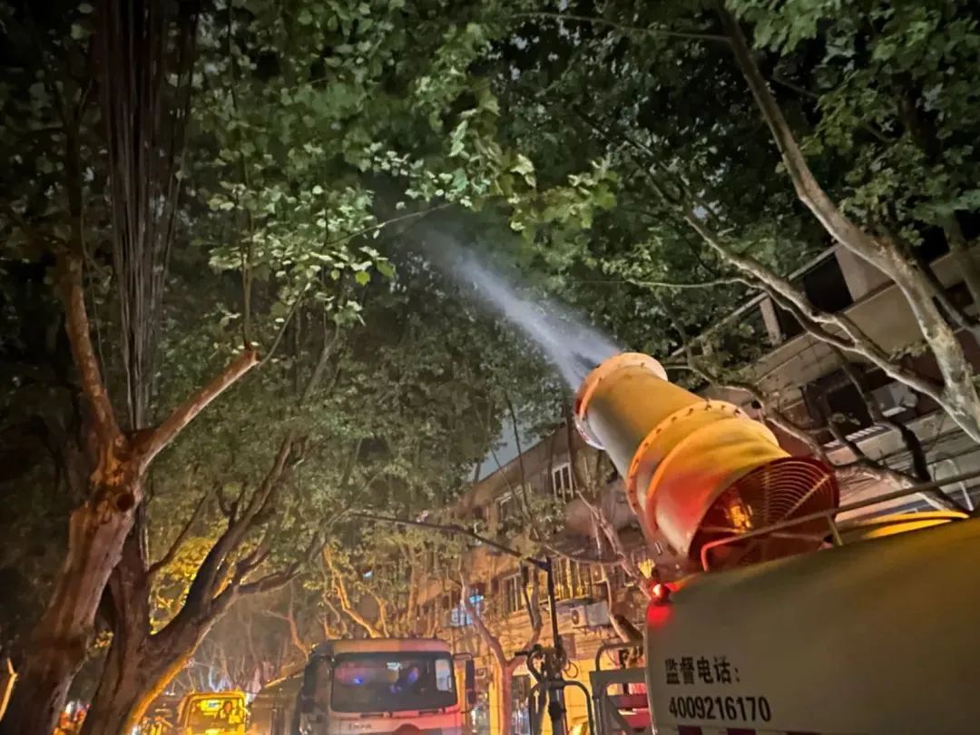 针对中心城区树形高大,且修剪作业条件受限的道路,采取物理吹冲“四件套”的措施来防控。先用高射程风力机将成熟、即将脱落的果球吹落,再用抑尘车喷洒水雾将果毛降至地面,接着用高压洒水车将果毛集中冲到路牙边,最后由机动清扫车负责路面、环卫工人负责在人行道将果毛收集清扫收尾。
