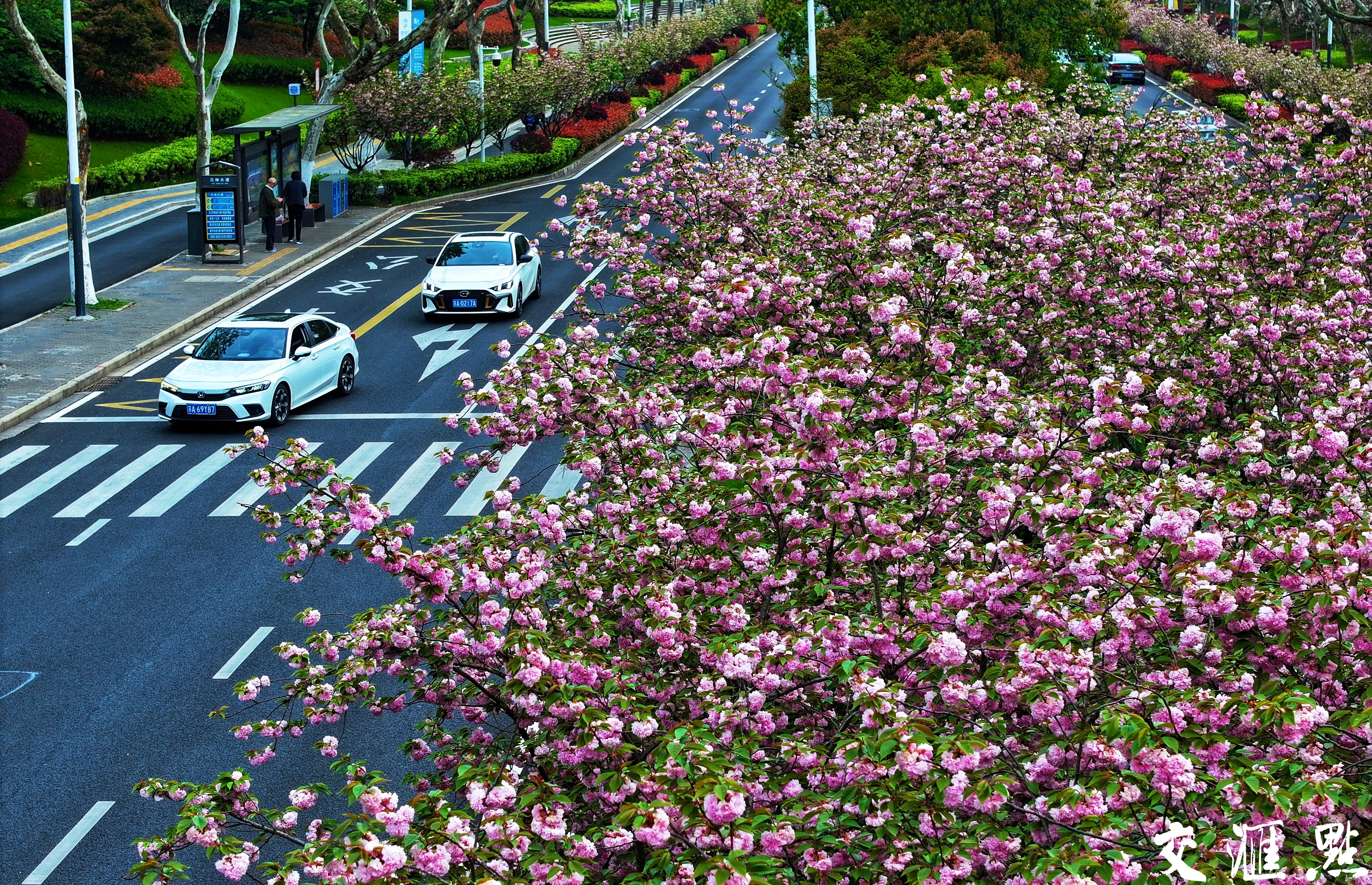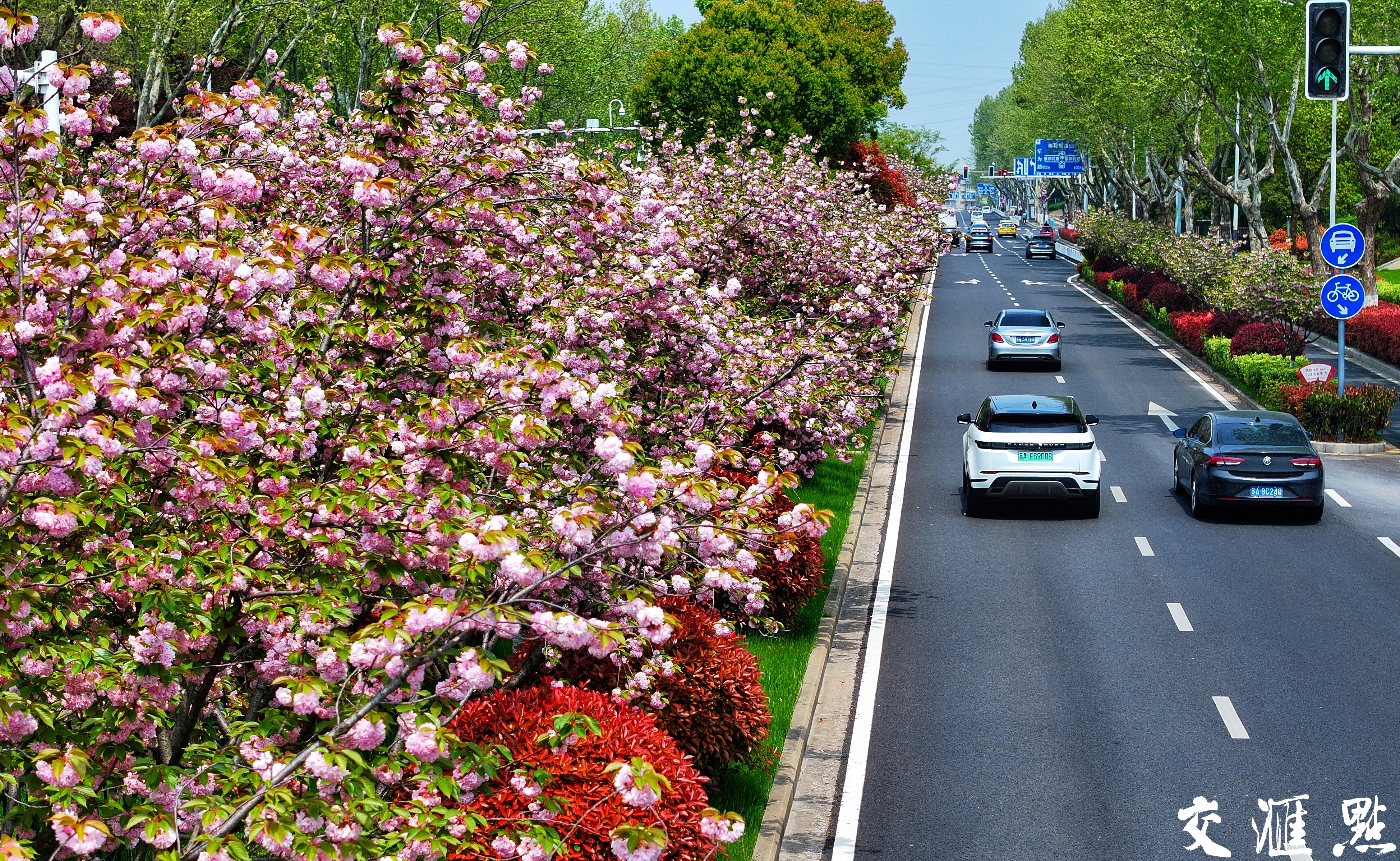 2024年4月11日,南京雨花台区花神大道数千株晚樱迎来盛花期。花瓣浅红,重重叠叠,一团团、一簇簇,坠满枝头。开车或是行走在花神大道上,置身于花的海洋,惬意十足,美不胜收。新华日报·交汇点记者 赵亚玲摄