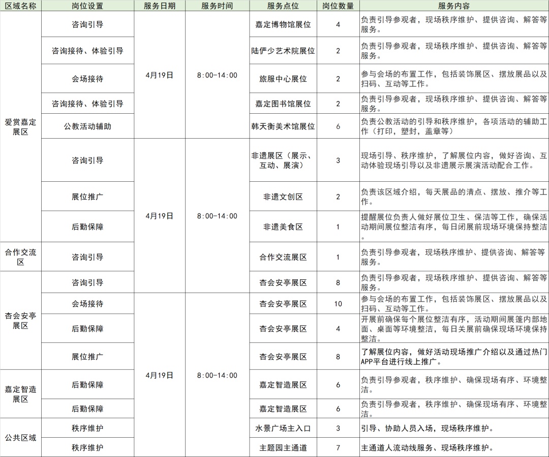 @嘉定的小伙伴们 2024年上海汽车文化节 将于4月19日至5月31日举行。 汽车文化节“梦想嘉”主题园 社会志愿者招募工作(第一期)启动啦, 相关事项如下↓ 一、招募时间 即日-4月12日 二、服务地点 上海国际赛车场水景广场(嘉定区伊宁路2000号,上海赛车场轨交站5号口) 三、招募对象 嘉定区志愿者(20-45周岁),具有赛事、展会等大型活动志愿服务经验优先。 四、服务内容 1.咨询引导、秩序维护:协助做好园内人员疏导、展区指引及现场秩序维护、提供咨询、解答等服务; 2.后勤保障、会场展陈:协助做好摊位布置及环境清洁等服务; 3.展位推广、活动辅助:协助做好活动现场推广介绍以及通过热门APP平台进行线上推广及公教活动的辅助工作。 五、岗位设置及要求 六、相关保障 报名参与本次志愿服务的志愿者应当为“上海志愿者网”实名注册志愿者,享有“上海志愿者”人身意外伤害保险。 志愿者上岗前将由组织方统一进行培训,并提供上岗必要的志愿者标识(志愿者马甲或徽章等统一标识)、饮水等保障物资。组织方将及时准确通过“上海志愿者”进行服务时长记录。 七、报名方式 请符合要求的社区志愿者填写好报名信息表(点击此处获取,密码:89ht),并于4月12日16:00前发送至所在街镇社区志愿服务中心进行报名。被录用的志愿者将由工作人员电话联系通知上岗事宜。