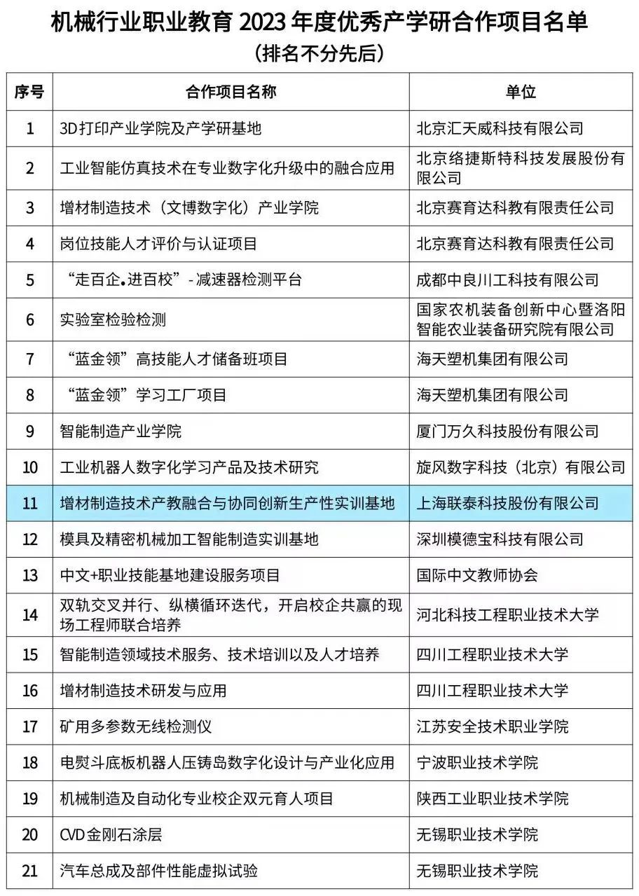 机械行业职业教育2023年度优秀产学研合作项目名单日前公布,松江企业上海联泰科技股份有限公司榜上有名,同时也是上海市唯一一家入选单位。
