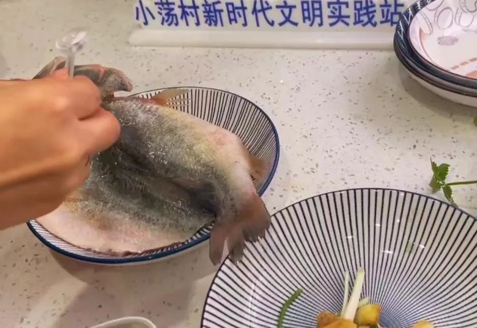 鲈鱼洗净、鱼头鱼尾从中间劈开,生姜切片、大葱切段,加入少许盐腌制十五分钟。