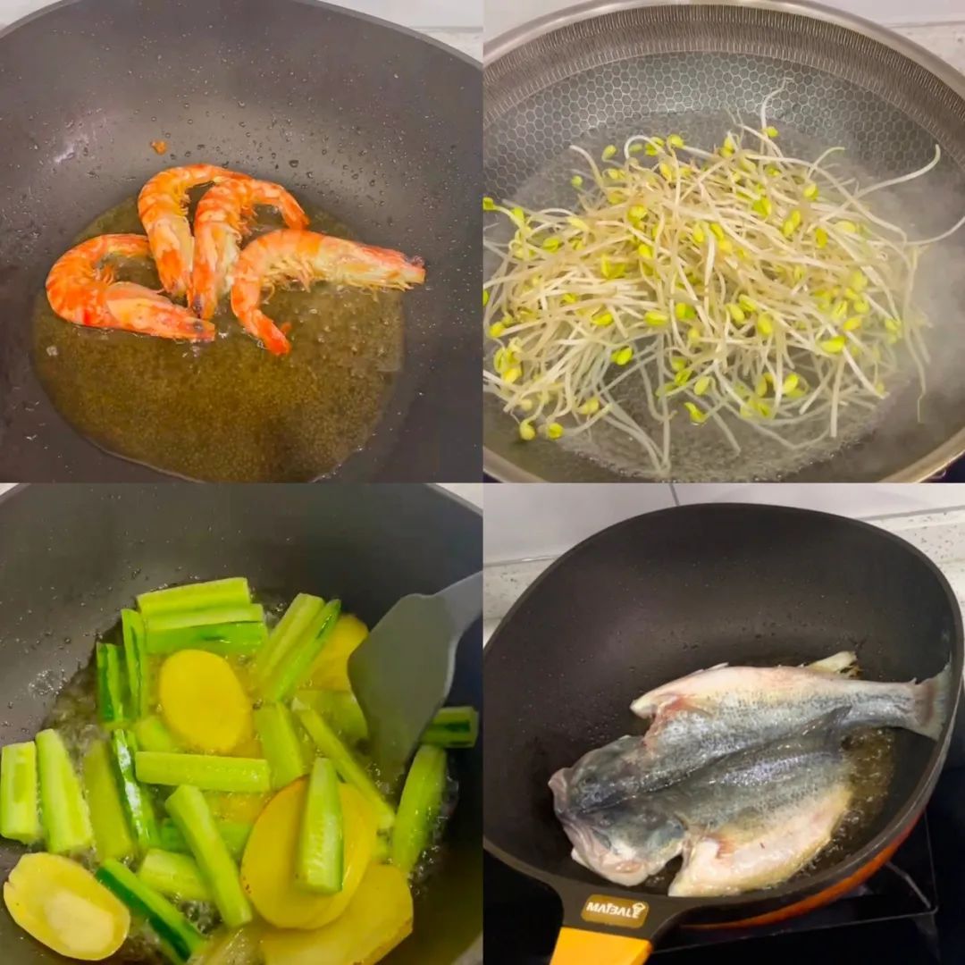 将基围虾煎至五成熟,豆芽汆水,土豆黄瓜翻炒至断生,鲈鱼煎至两面微黄。