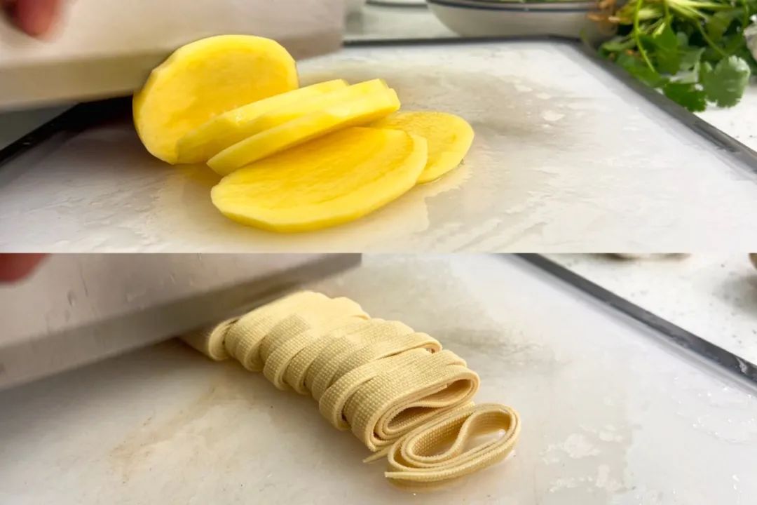 各类蔬菜、虾洗净备用,土豆去皮切片,黄瓜切段,豆皮切丝。