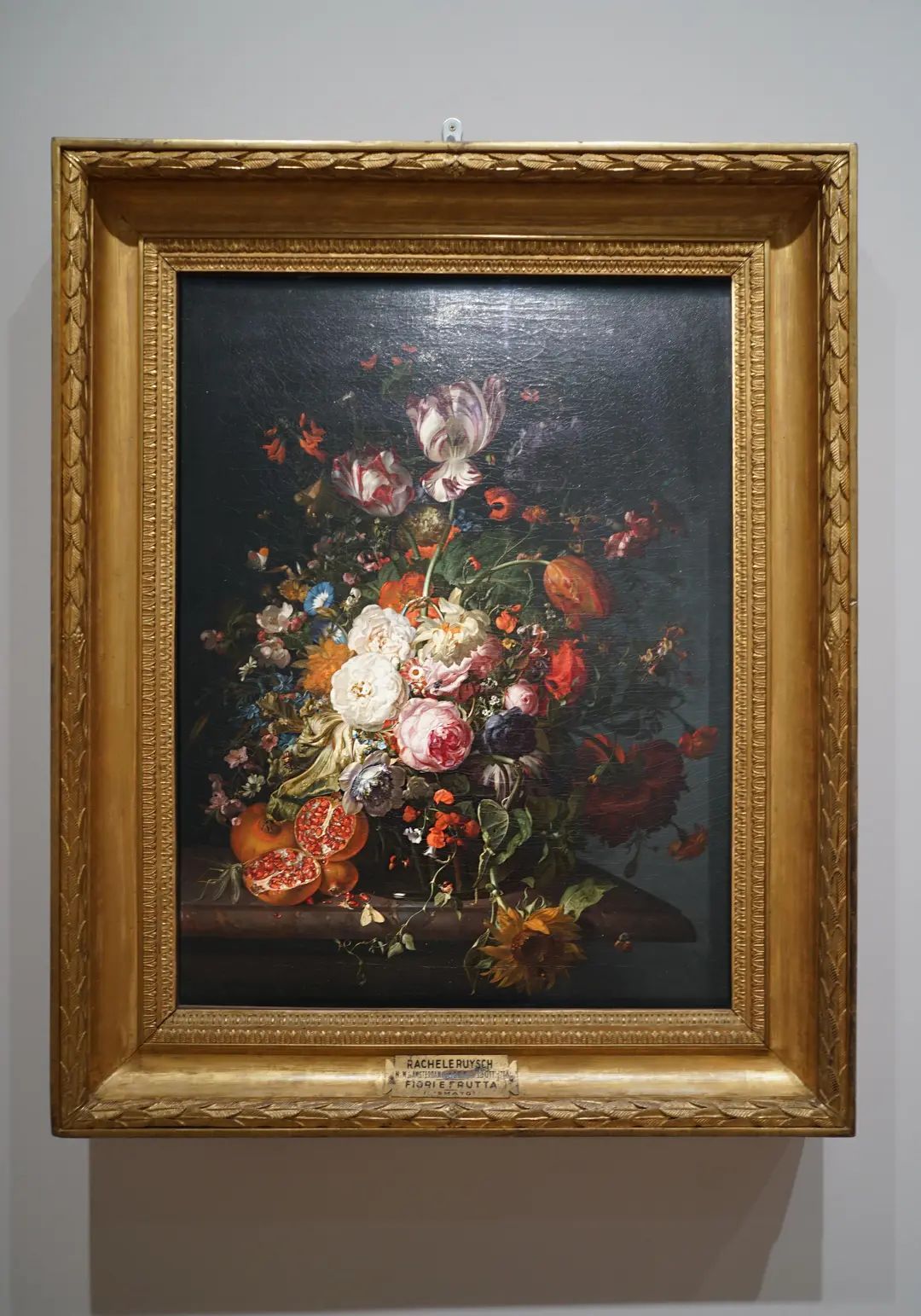 卡拉瓦乔曾说,要描绘“一幅花卉静物,如画人物”,需要同等精湛的技艺。展厅中荷兰女画家雷切尔·勒伊斯的《静物》就是一张非常典型的尼德兰风格花卉静物。暗色的背景中,一束极致繁密的花束充满了整个画面,有几十种不同的花卉,还点缀着十几种不同的昆虫、蠕虫和蝴蝶。独树一帜的花卉静物风格,雷切尔·勒伊斯让成为当时引领时代的佼佼者。