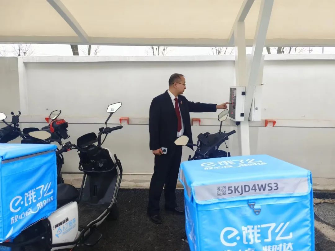 普陀区检察院联合街道办事处以及“饿了么”等重点企业,与公租房运营单位一同为骑手小哥搭建“无忧省‘新’换(充)电站示范点位”,满足换(充)电需求量大的骑手小哥生活工作需求,杜绝公寓内用电隐患。